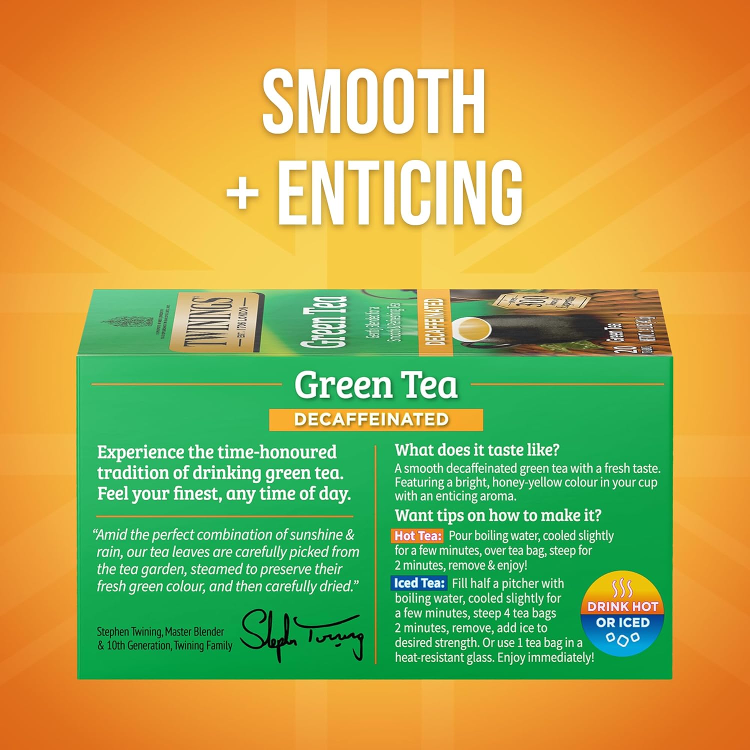Twinings Decaffeinated Green Tea Individually Wrapped Bags, 20 Count (Pack of 6), Smooth Flavour, Enticing Aroma, Enjoy Hot or Iced, 120 Teabags