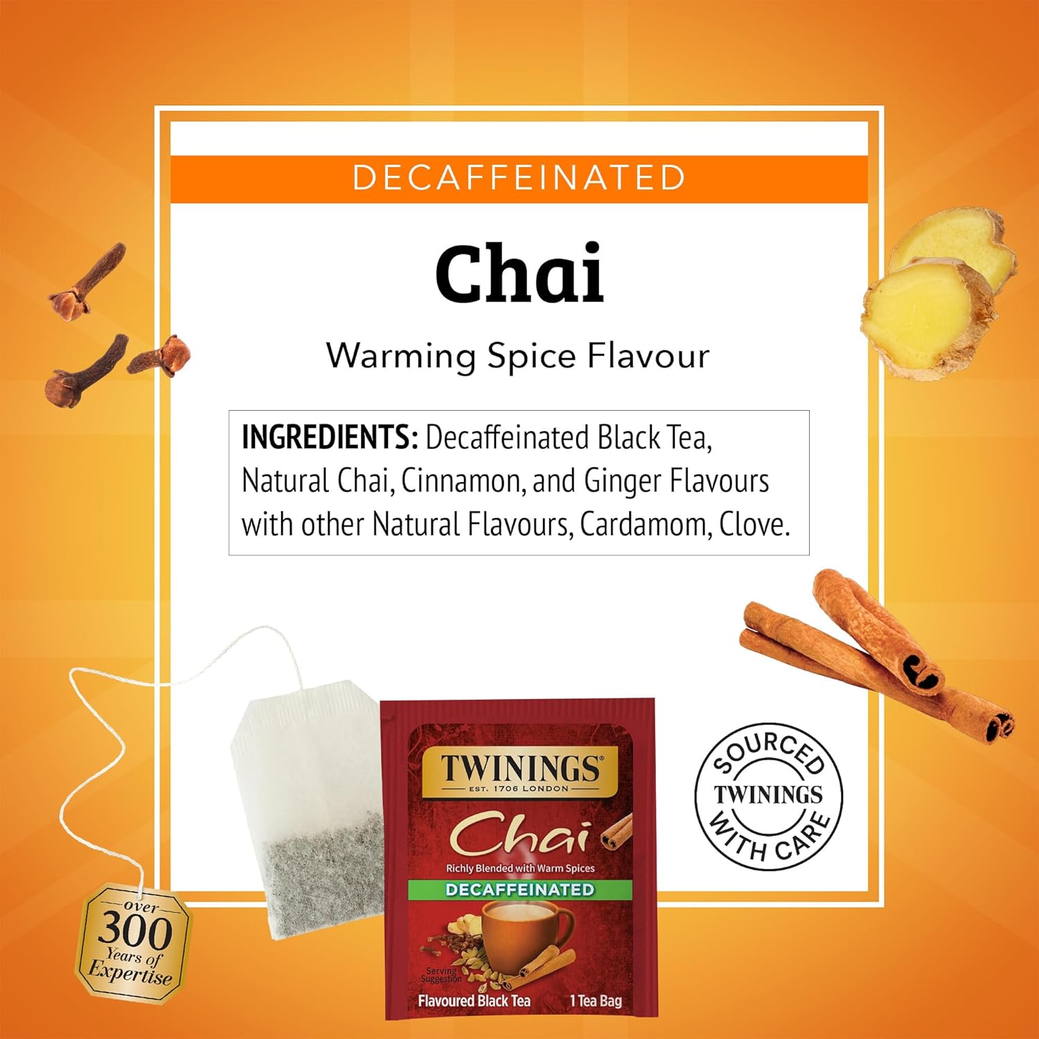 Twinings Decaffeinated Chai Individually Wrapped Bags, 20 Count (Pack of 1), Sweet, Savoury Spices, Enjoy Hot or Iced, 20 Teabags