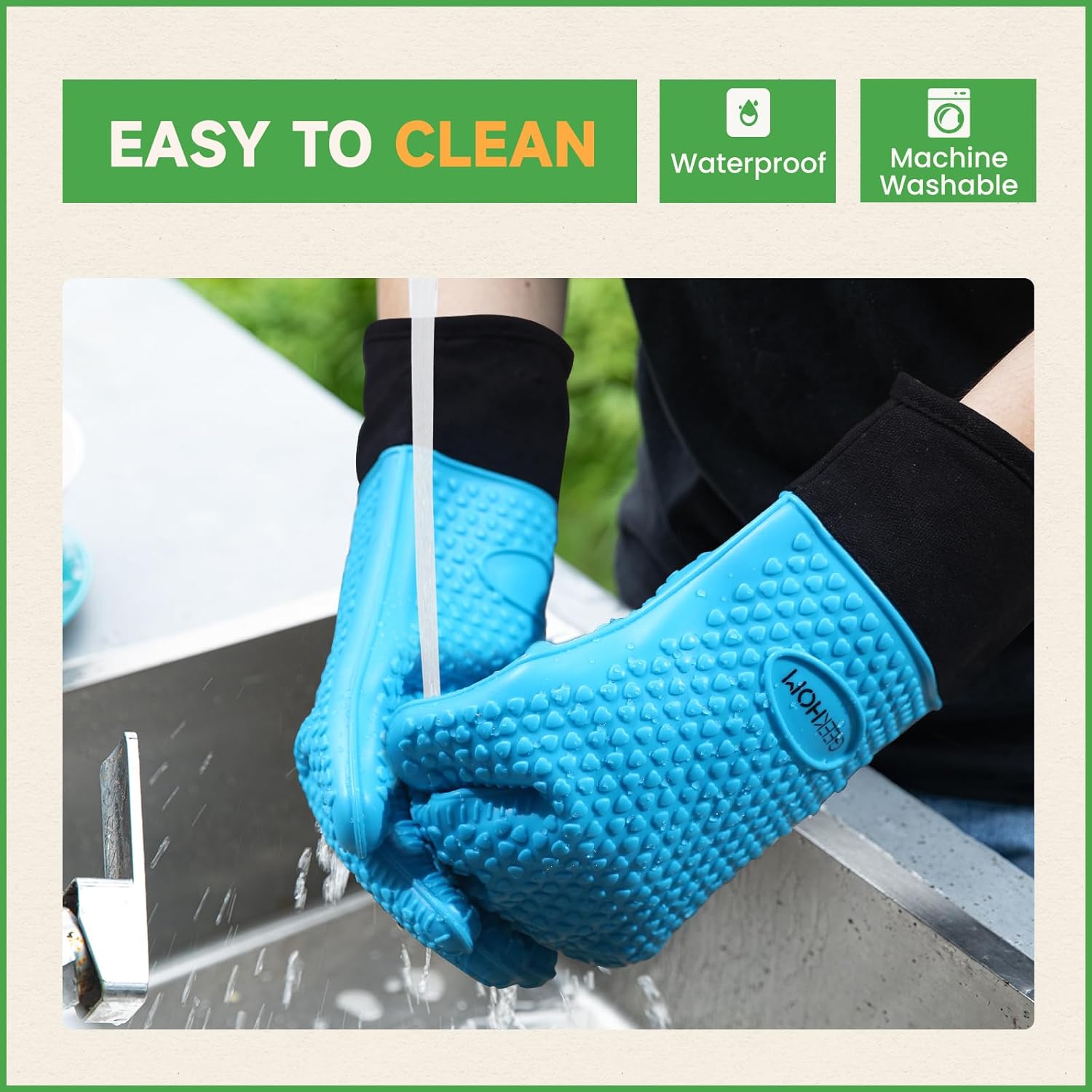 - Unrivaled Heat Defense for Ultimate Safety: Engineered with heat-resistant silicone up to 446°F, our oven mitts protect hands from scorching grill surfaces, boiling pots, and oven racks while maintaining flexibility to flip burgers or adjust smoker vents effortlessly; The 13.7" extended length with 3.17” sleeve shields wrists during outdoor barbecue adventures