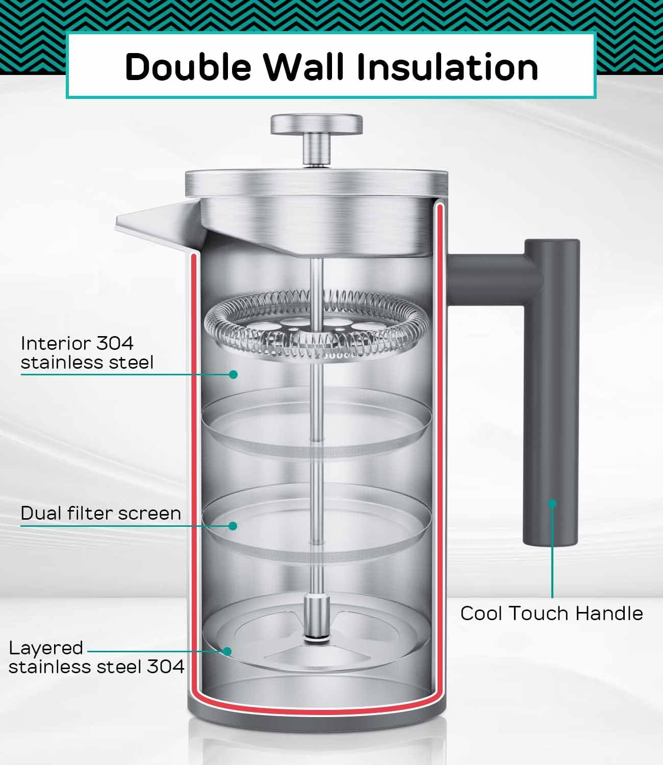- Keep it steamy, the stainless steel french press keeps coffee (or tea) warm 60 minutes longer than glass coffee presses! It also has a cool-touch handle and a spring-loaded, double-screen filter that will deliver one mean and clean cup of joe