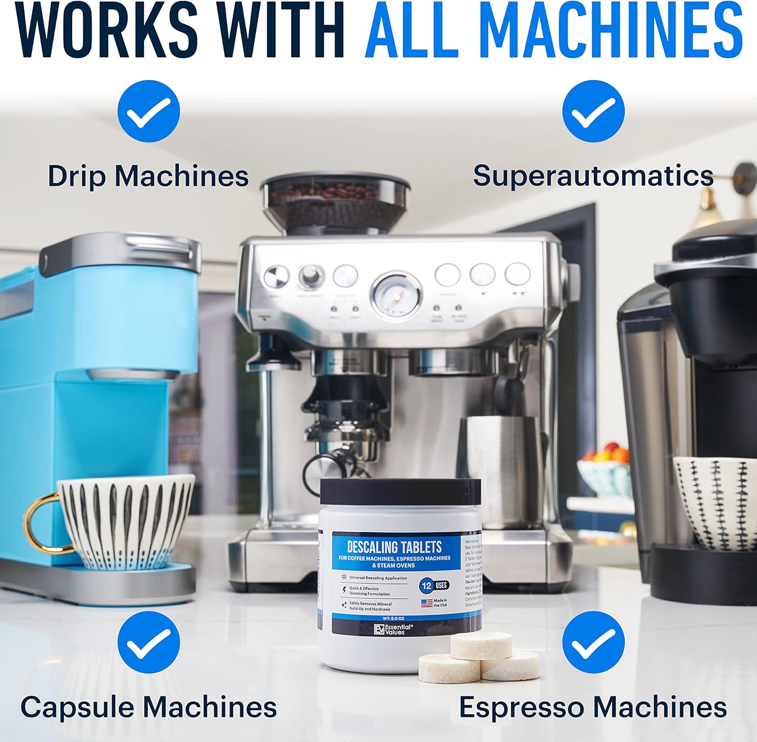 - Proudly Manufactured in USA - To us, quality is everything. We design, make and test our products here in the USA. Check out our entire coffee & espresso machine descaling solutions. Note: Essential Values has no affiliation or endorsement from any manufactures mentioned.
