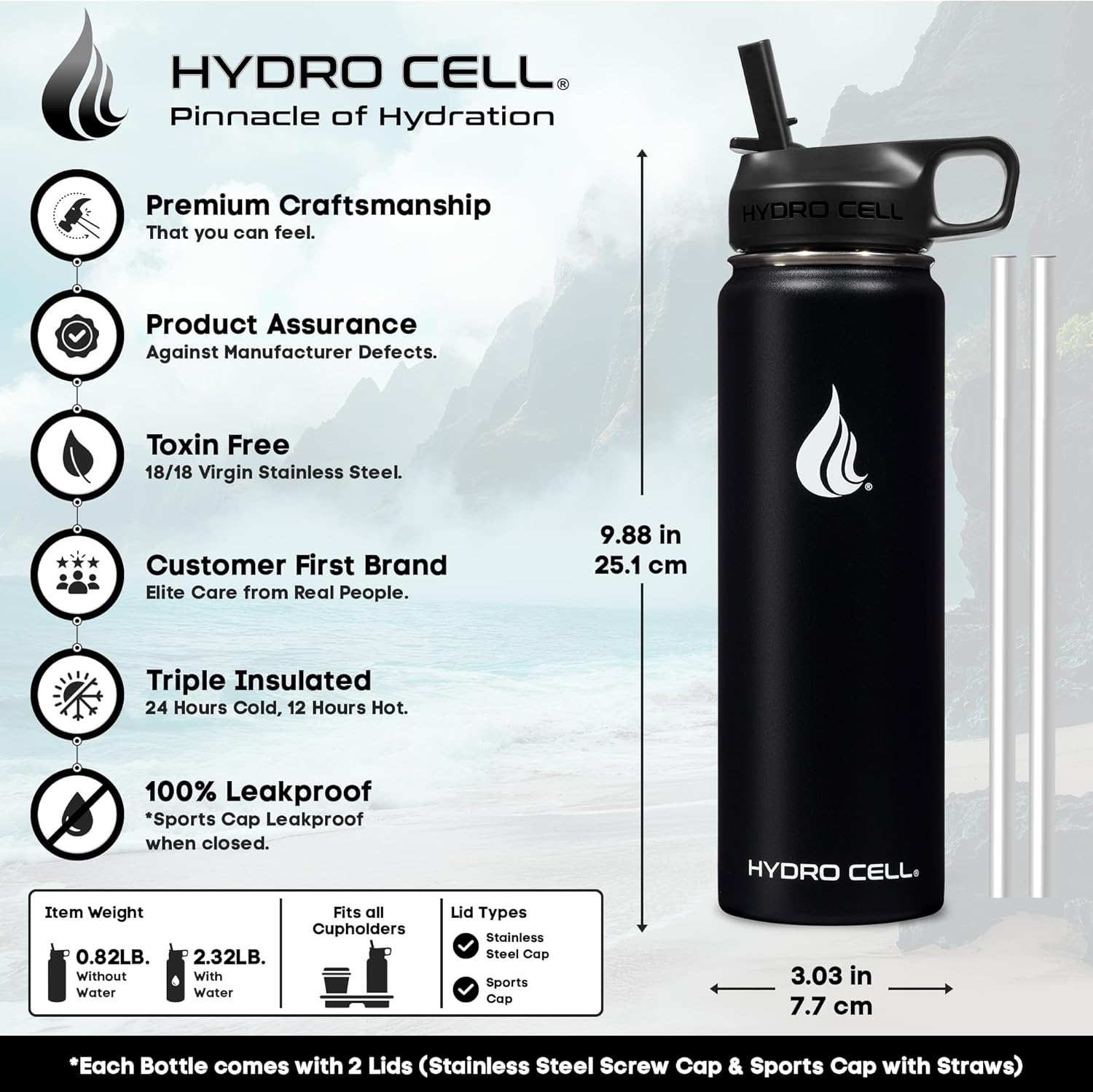 - STYLE: Purchase Includes Stainless Steel Bottle, Screw Cap (100% Airtight), Bonus Sports Cap with Straws (Cold Temp ONLY). Hydro Cell offers the largest selection of matching Paracord Handles, Bottle Boots, and Color Replacement Caps: Sold Separate, Linked Below. Customize your Hydro.