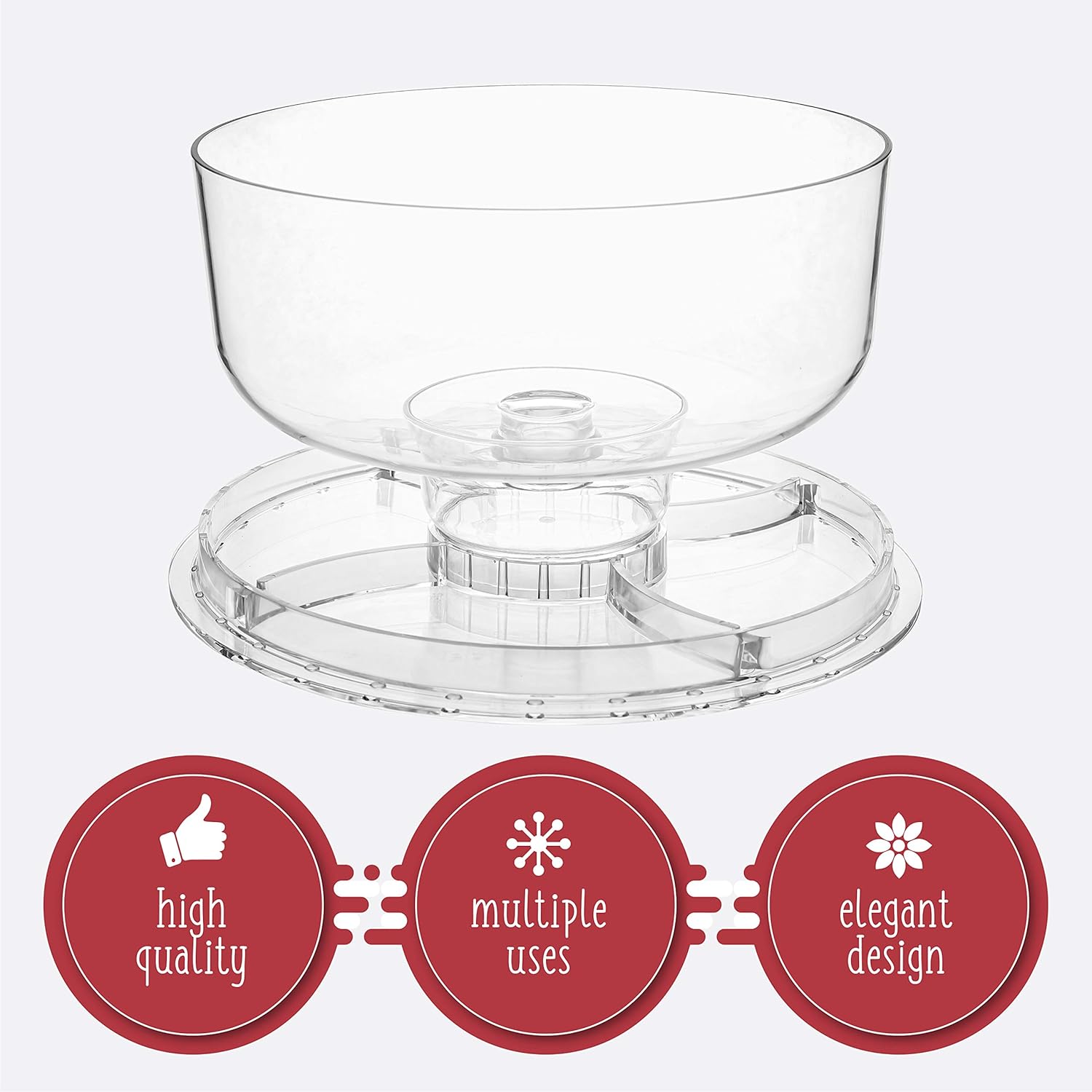 - MULTIFUNCTIONAL – This six in one multipurpose cake stand with lid is a unique cake stand with many functions and uses. Use it as a cake plate, cake tray, serving dish, punch and salad bowl, chips and salsa plate, and baking goods stand. Simply invert the dome or plate to create any type of serving dish.