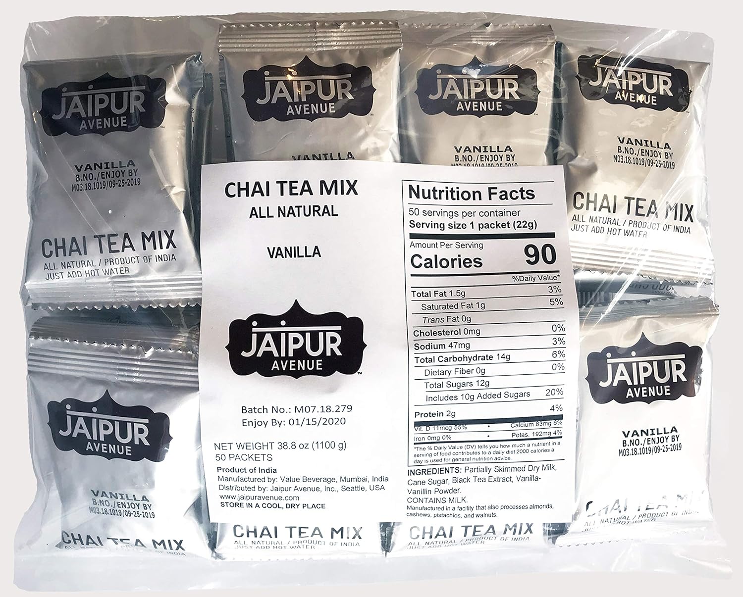 Jaipur Avenue Vanilla Chai Tea Mix Crafted with All-Natural Assam Black Tea, Vanilla, Cane Sugar, and Premium Dry Milk - Preservative-Free, Gluten-Free, Authentic Indian Chai Tea Latte (50-Count Bag)