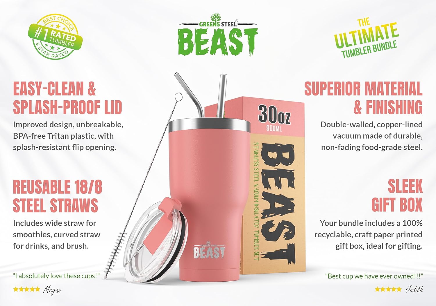 - EXCLUSIVE BONUS BUNDLE - Offering unrivaled value for money: 2 unbreakable straws: 1 curved; great for water + 1 wider & straight; ideal for shakes & smoothies + a straw brush & our upgraded pop up lid for super easy cleaning! Presented in a beautiful Gift Box. With so many second-rate tumblers available on the market we wanted to set ourselves apart and be the best!