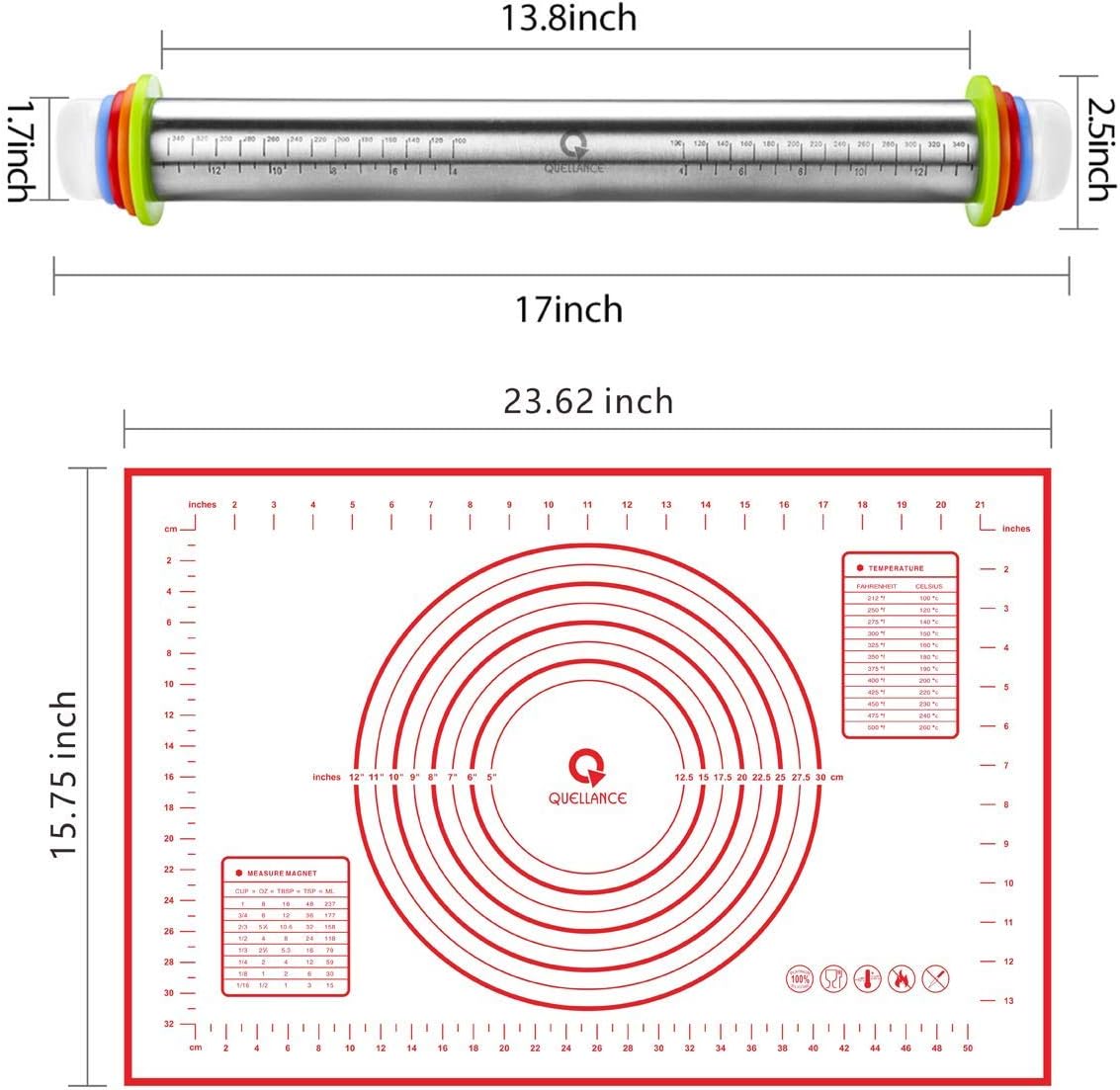 - [NEWEST UPGRADE - EASIER FOR BAKING] - With the pastry mat with measurements, Quellance cookie rolling pin is easy to roll the dough whatever the size you need. After done kneading, it is very easy to clean.