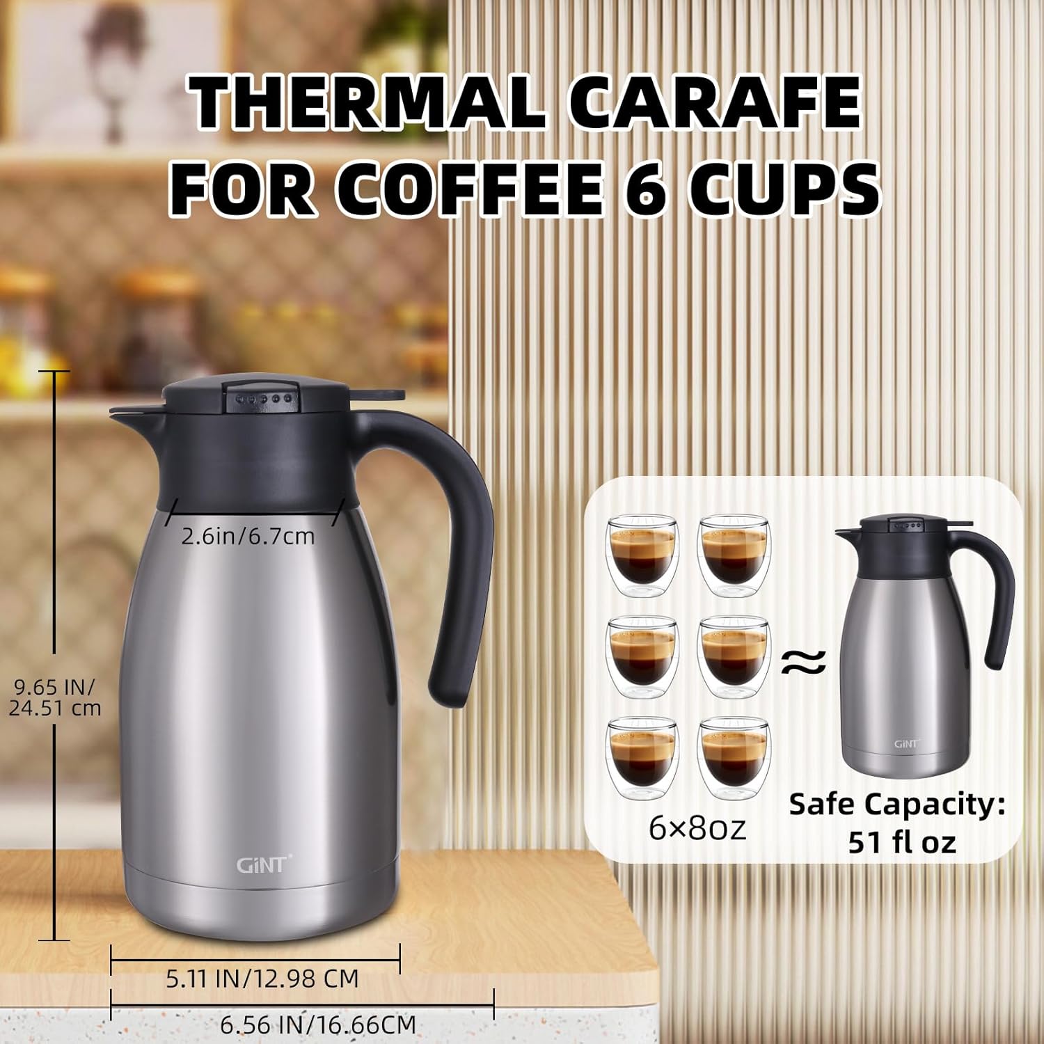 GiNT 51Oz Stainless Steel Thermal Coffee Carafe with Lid/Double Walled Vacuum Thermal Carafe / 12 Hour Heat Retention (Silver, 1.5L)