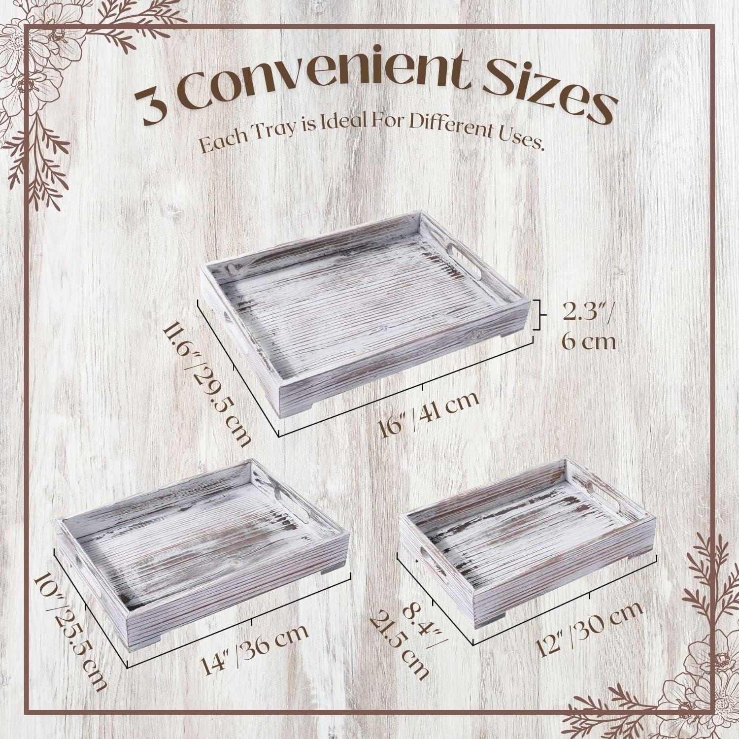 Flexzion Rustic Wooden Serving Tray with Handle - 3-Piece Set of Wooden Trays for Ottomans, Torched Whitewash Nesting Trays for Eating, Decoration, Coffee, Stackable Rectangular Breakfast Trays