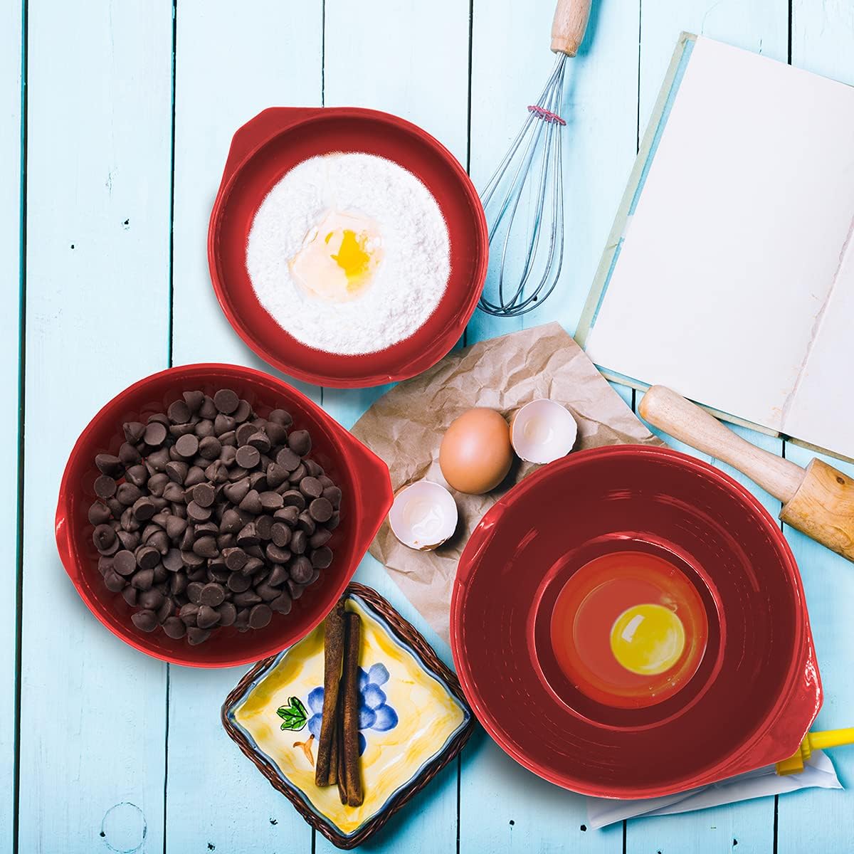 - NON-SLIP & NON-STICKY – Base is designed with a silicone bottom to keep each bowl from skidding or slipping during mixing. Ingredients won’t stick to the non-stick plastic surface, making lengthy mixing less tiring.