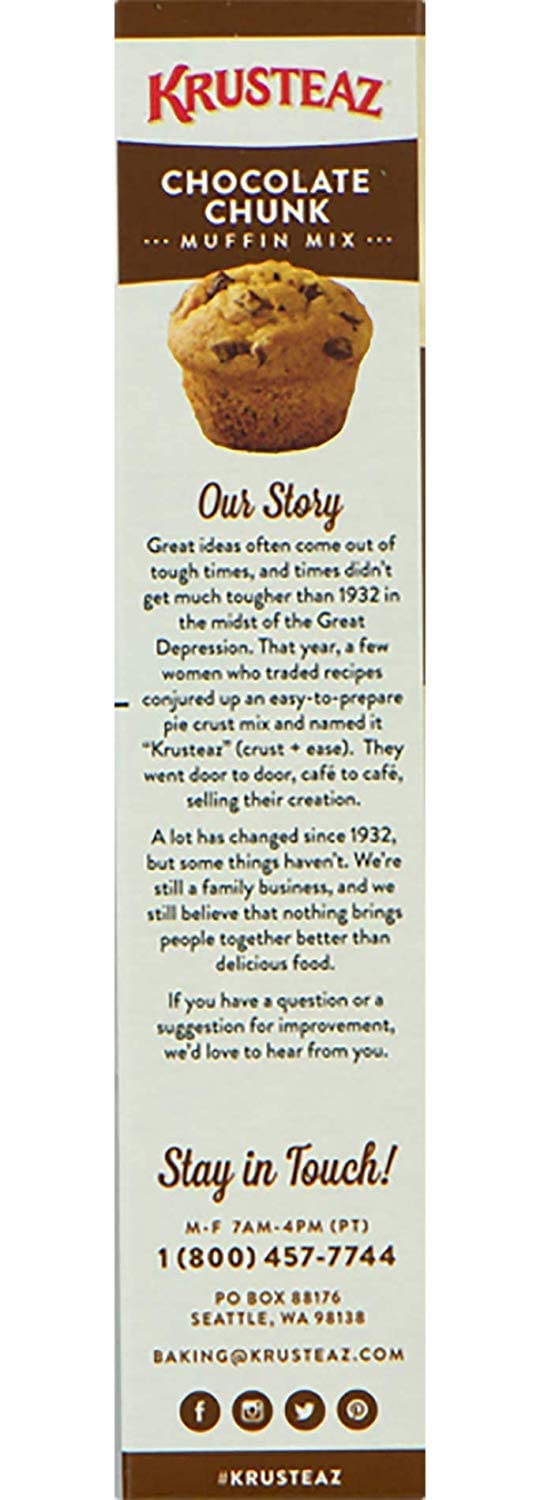 - INGREDIENTS WE’RE PROUD OF: Krusteaz Chocolate Chunk Muffin Mix is made with real chocolate chunks and no artificial flavors or preservatives.