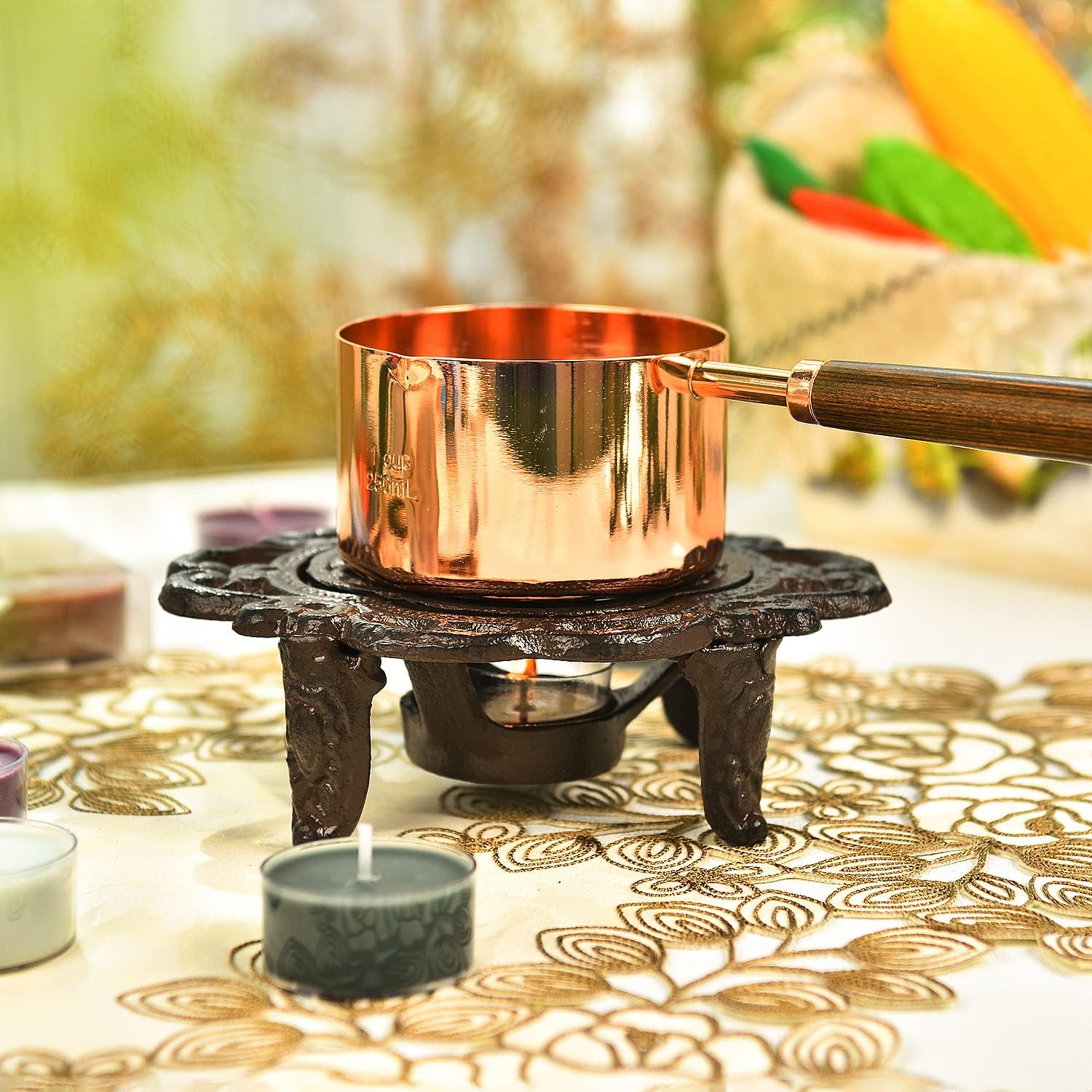 Sungmor Cast Iron Teapot Warmer Dish Cups Heater Pot Trivet - Rustic & Graceful Pattern Design with Tealight Holder - Heavy Duty & Decorative Candle Holder Stands for Heat Food Coffee Milk or Tea