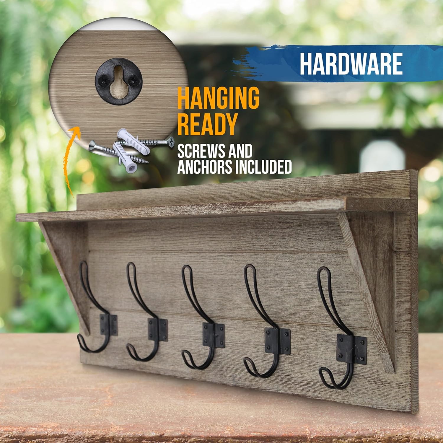 HBCY Creations Rustic Wall Mounted Coat Rack with Shelf - Solid Wood 24" Entryway Shelf with 5 Coat Hangers. Perfect Touch for Your Entryway, Mudroom, Kitchen, Bathroom and More, Weathered Brown