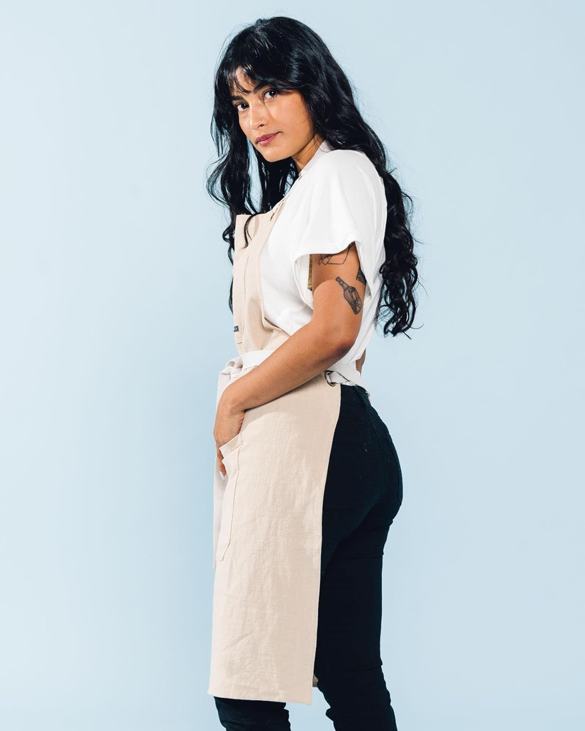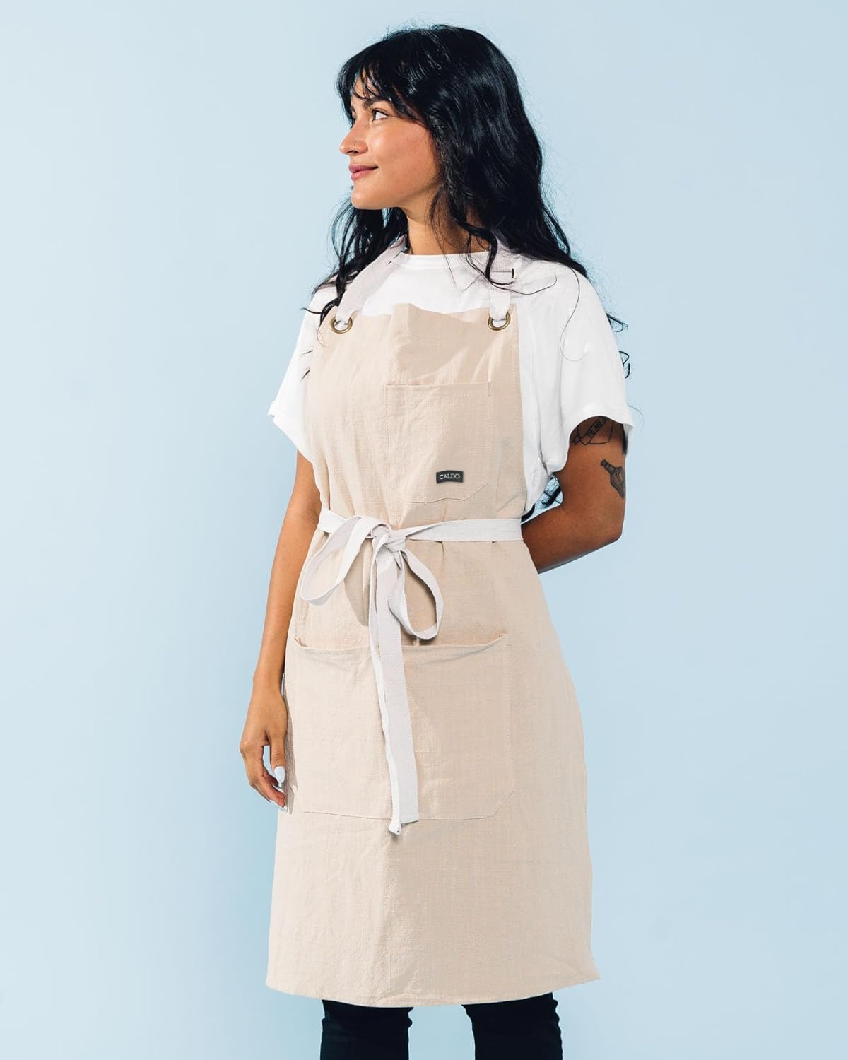Caldo Linen Kitchen Apron for Cooking- Mens and Womens Linen Bib Apron for Professional Chef, Server, or Barista- Adjustable with Pockets (Bone)