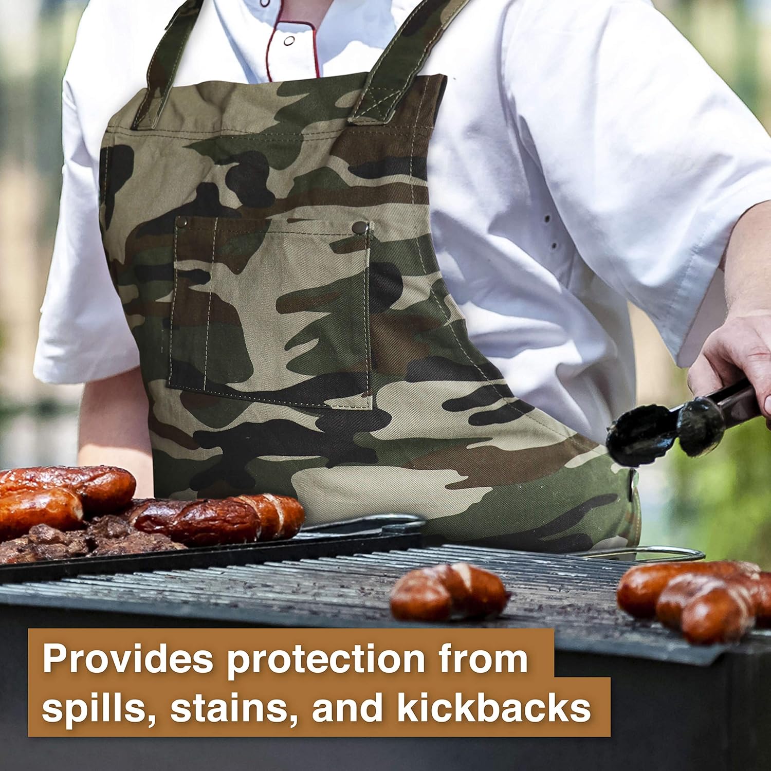 - Adjustable Size & Quick Release Buckle - Measuring 34 × 27 inches, the Professional Grade Chef Apron provides full chest-to-knee coverage. The HDG806A has long straps that allow you to adjust it around your waistline. Whether you’re 5’3 or 6’4 with a 50-inch waistline, this camo apron’s got you covered. It looks good on the menfolk, but it’s also great for those looking for aprons for women.