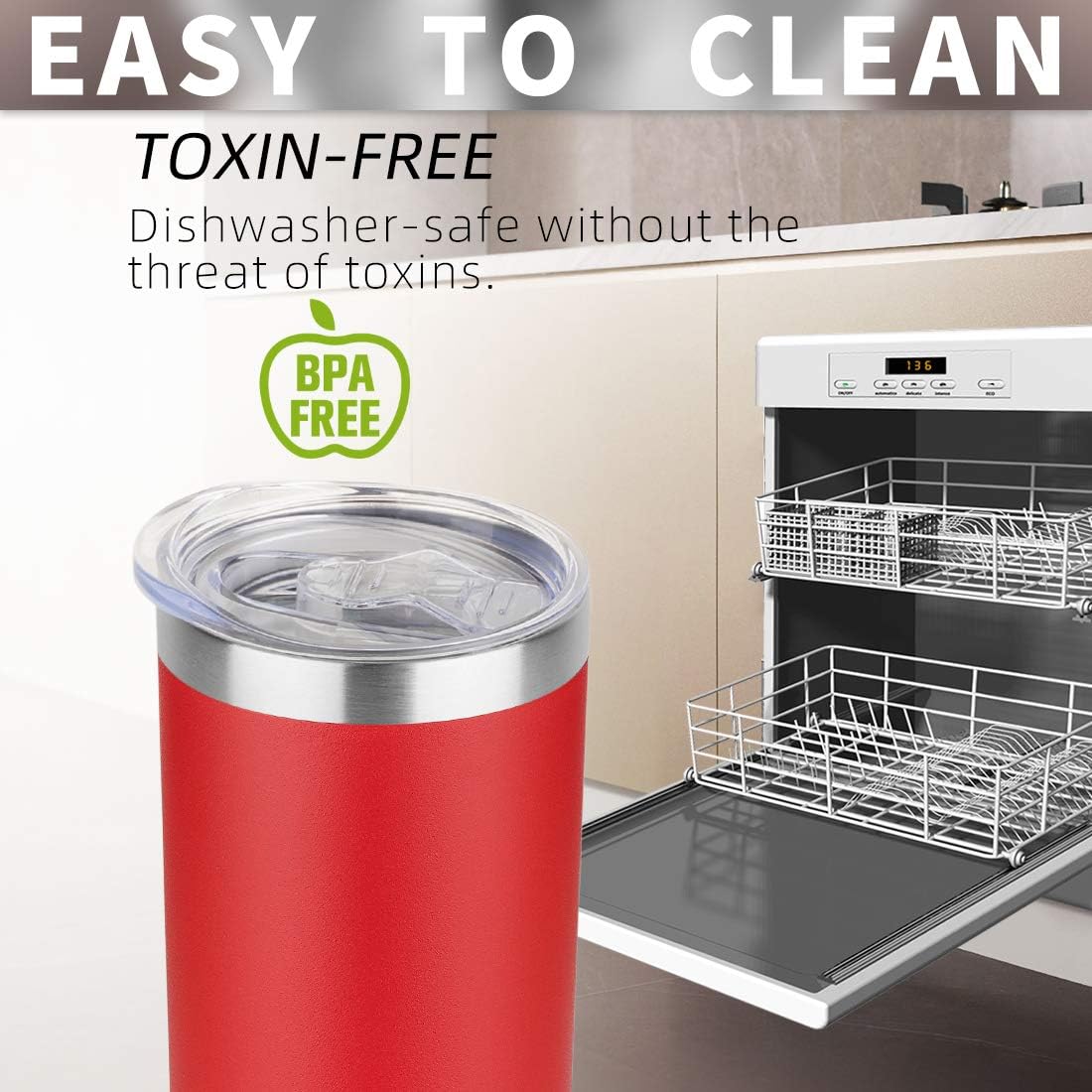 - LIFETIME DURABILITY:304 food grade stainless steel body, BPA free, healthier than plastic cup. The insulated tumbler never sweat due to the Vacuum insulated design. Powder coating on the outside fits more comfortably in your hand, looks good, anti-slip