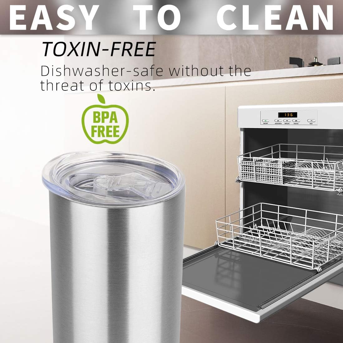 - LIFETIME DURABILITY:304 food grade stainless steel body, BPA free, healthier than plastic cup. The insulated tumbler never sweat due to the Vacuum insulated design. Powder coating on the outside fits more comfortably in your hand, looks good, anti-slip
