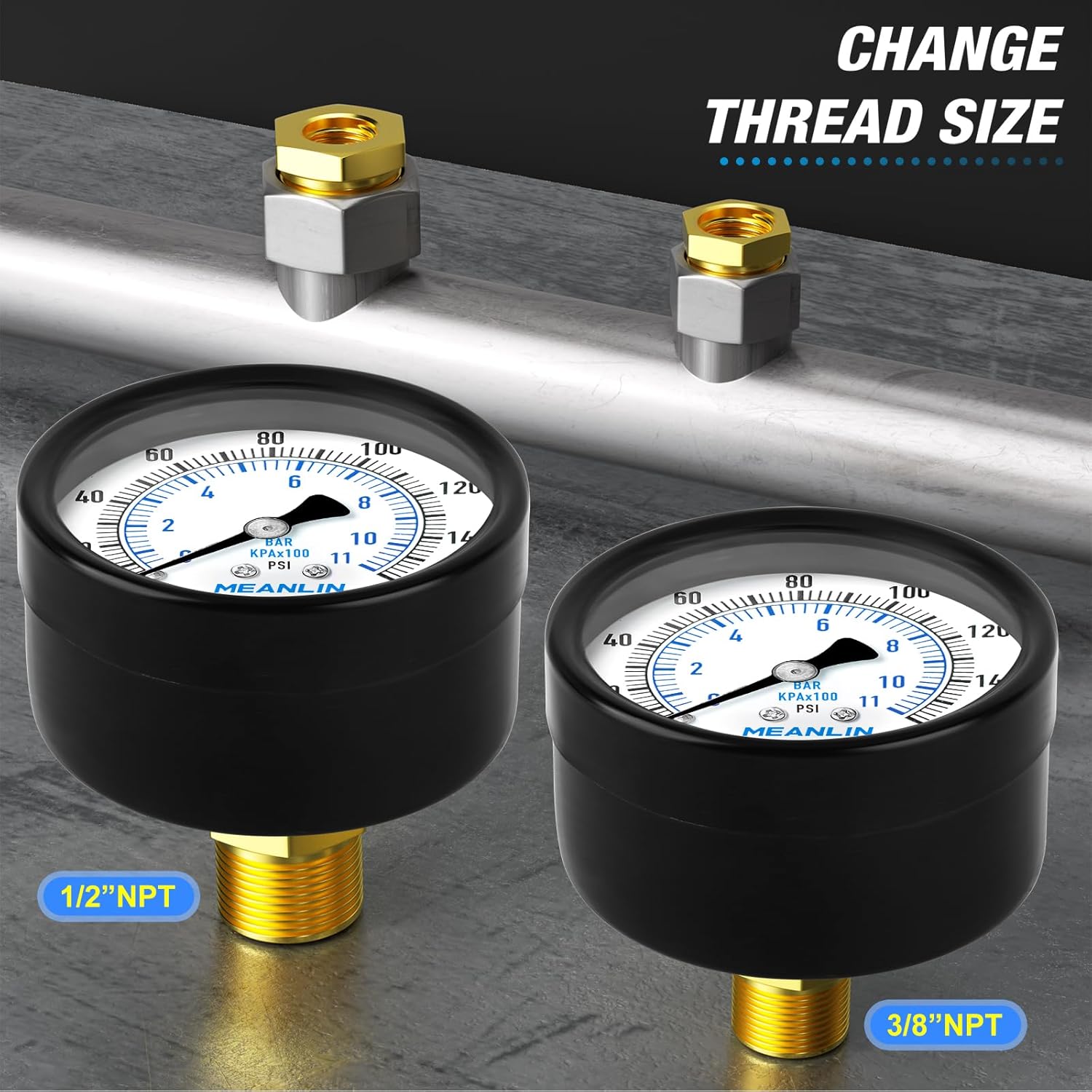 MEANLIN MEASURE 0-160Psi 2" DIAL FACE 1/4" NPT Well Pump Pressure Gauge, with 1/2" NPT and 3/8" NPT Hex Bushing, 3-2-3% Accuracy, Center Back Mount