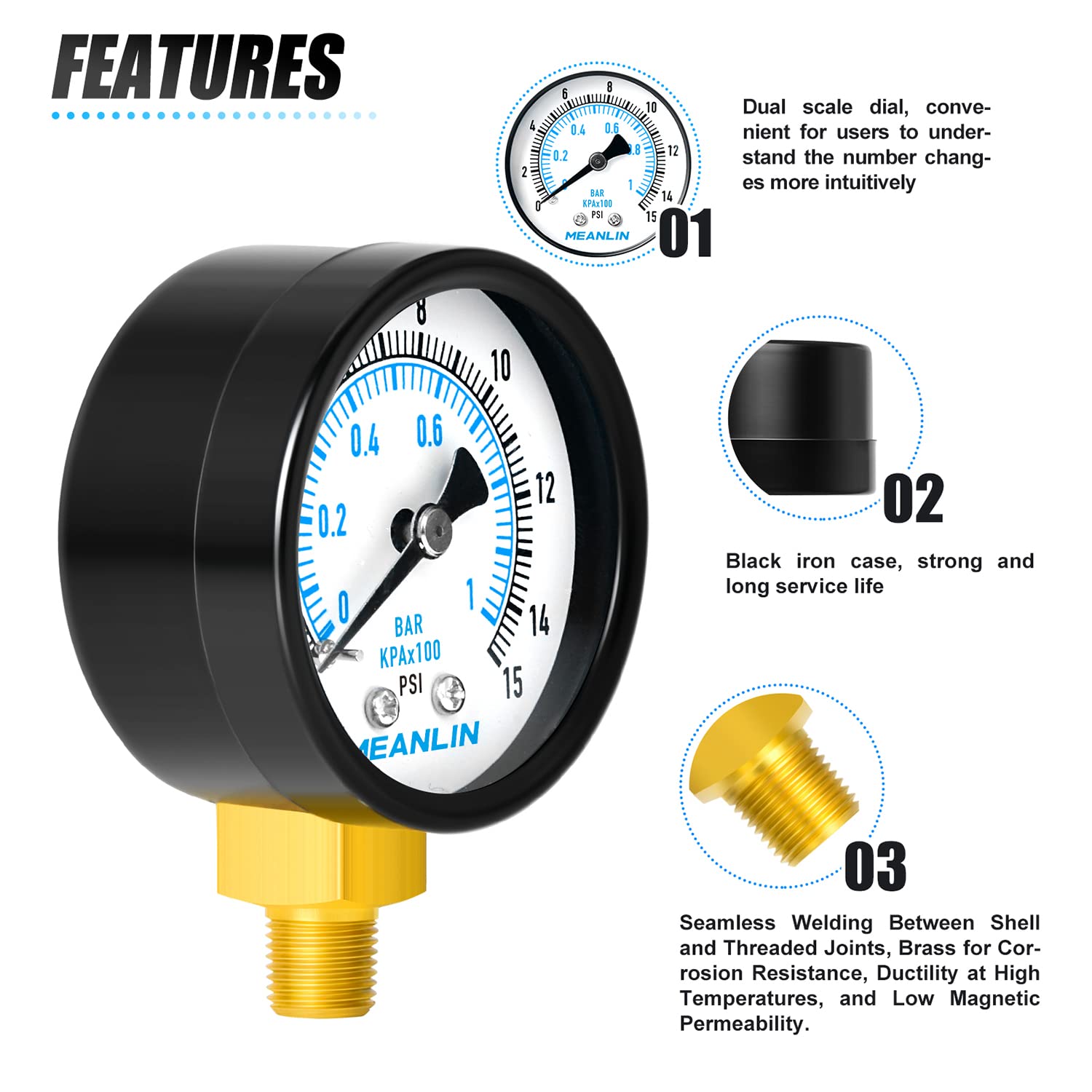 MEANLIN MEASURE 0-15Psi 2" DIAL FACE 1/8" NPT Well Pump Pressure Gauge, with 1/4" NPT and 3/8" NPT Hex Bushing, 3-2-3% Accuracy, Lower Mount