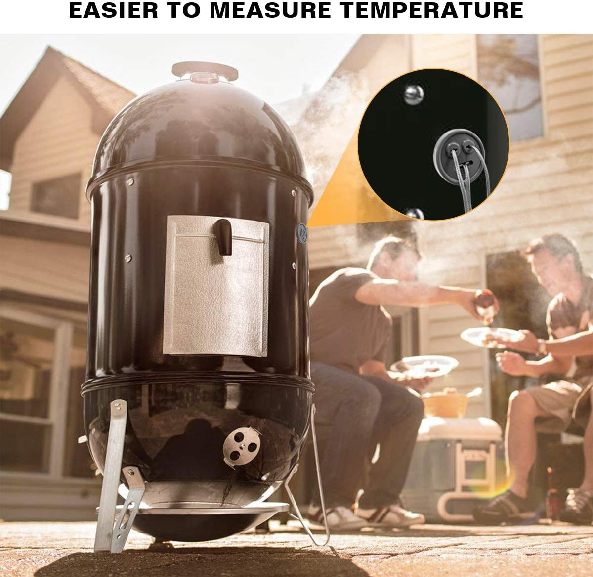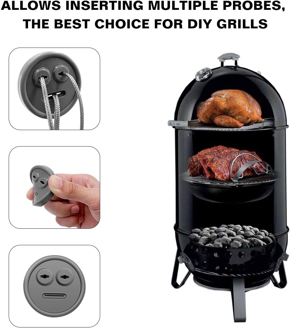 - MEASURE TEMPERATURE EASILY: Thermometer probe port makes the probe to easily enter the grills without crushing the probe sensor line. The three-hole design, allows for multiple probes to be inserted, two small round hole is perfect for smaller probes and the Line hole is great for large or dual probes