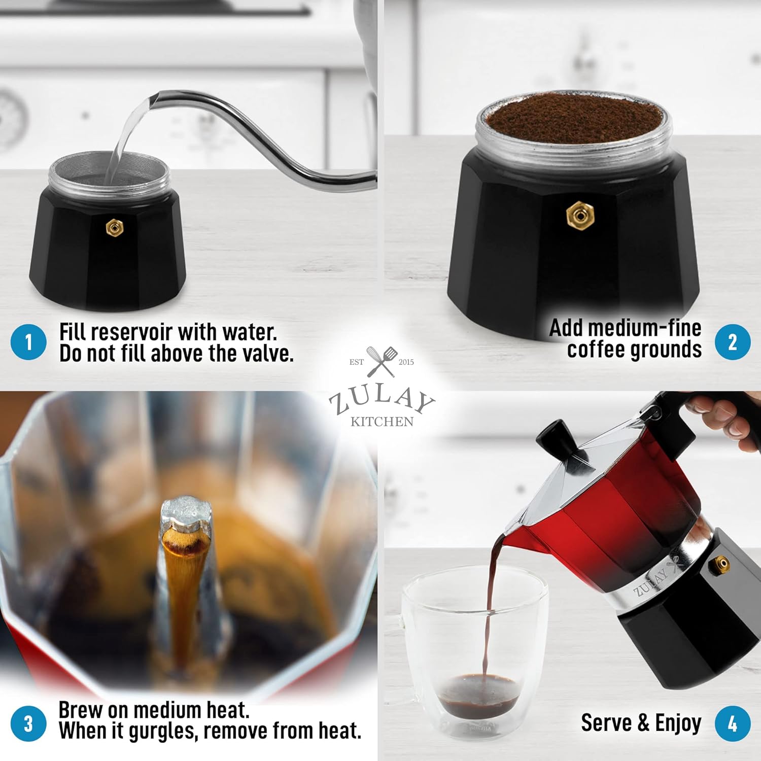 Zulay Kitchen Stovetop Espresso Maker - Moka Pot 3 Espresso Cups - Percolator Coffee Maker for Classic Cuban & Italian Style Espresso - Portable Coffee Maker for Camping & Travel - (Red/Black)