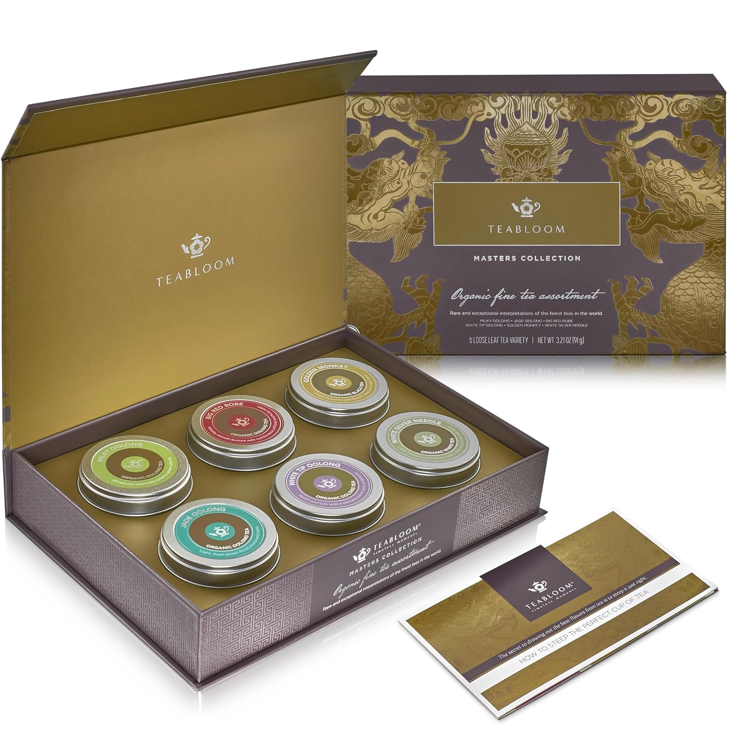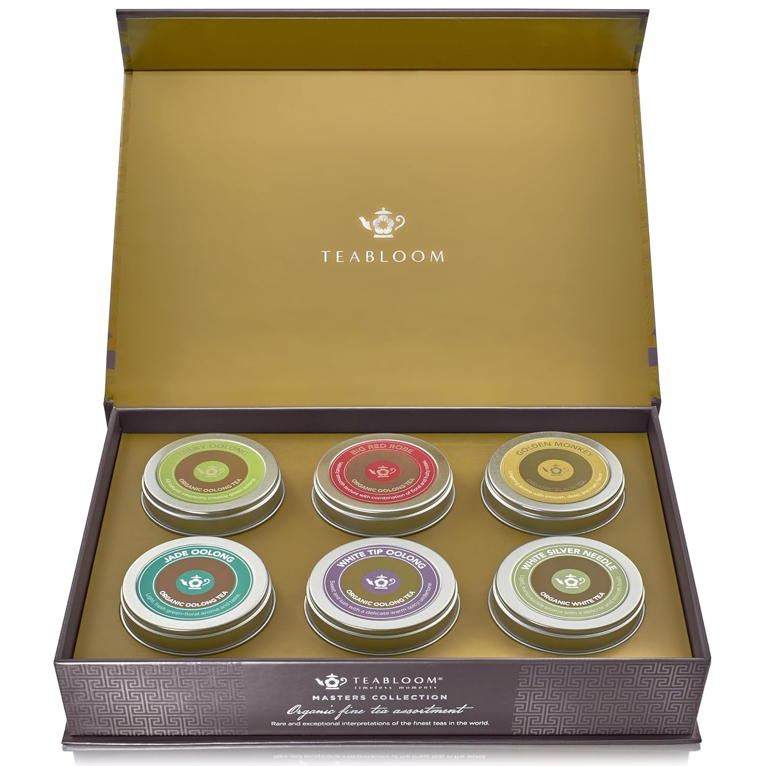 Teabloom Masters Collection - Six Rare Single-Origin Organic Loose Leaf Teas - Milky Oolong, White Silver Needle, Big Red Robe, Golden Monkey, Jade and White Tip Oolong