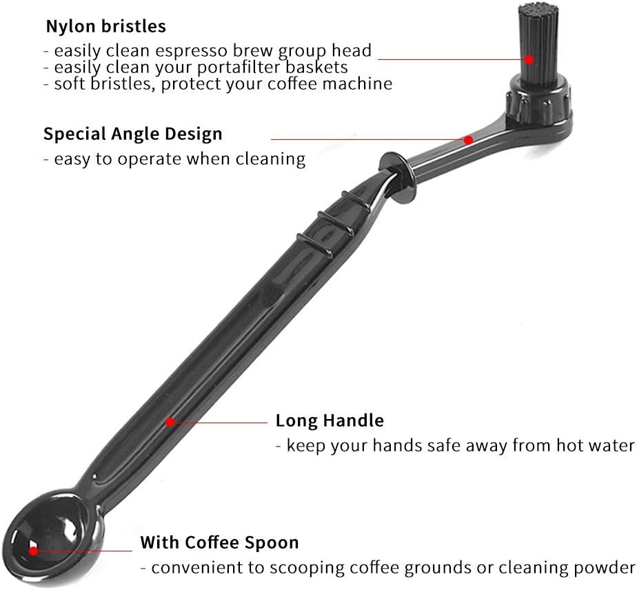 - 【Professional Design Espresso Brush Tool】- Special angle design brush can clean tight spaces and any corner of the coffee machine, the handle is long enough to keep your hands safely away from hot water when cleaning the machine, it can keep your hands cool and dry when back flushing.