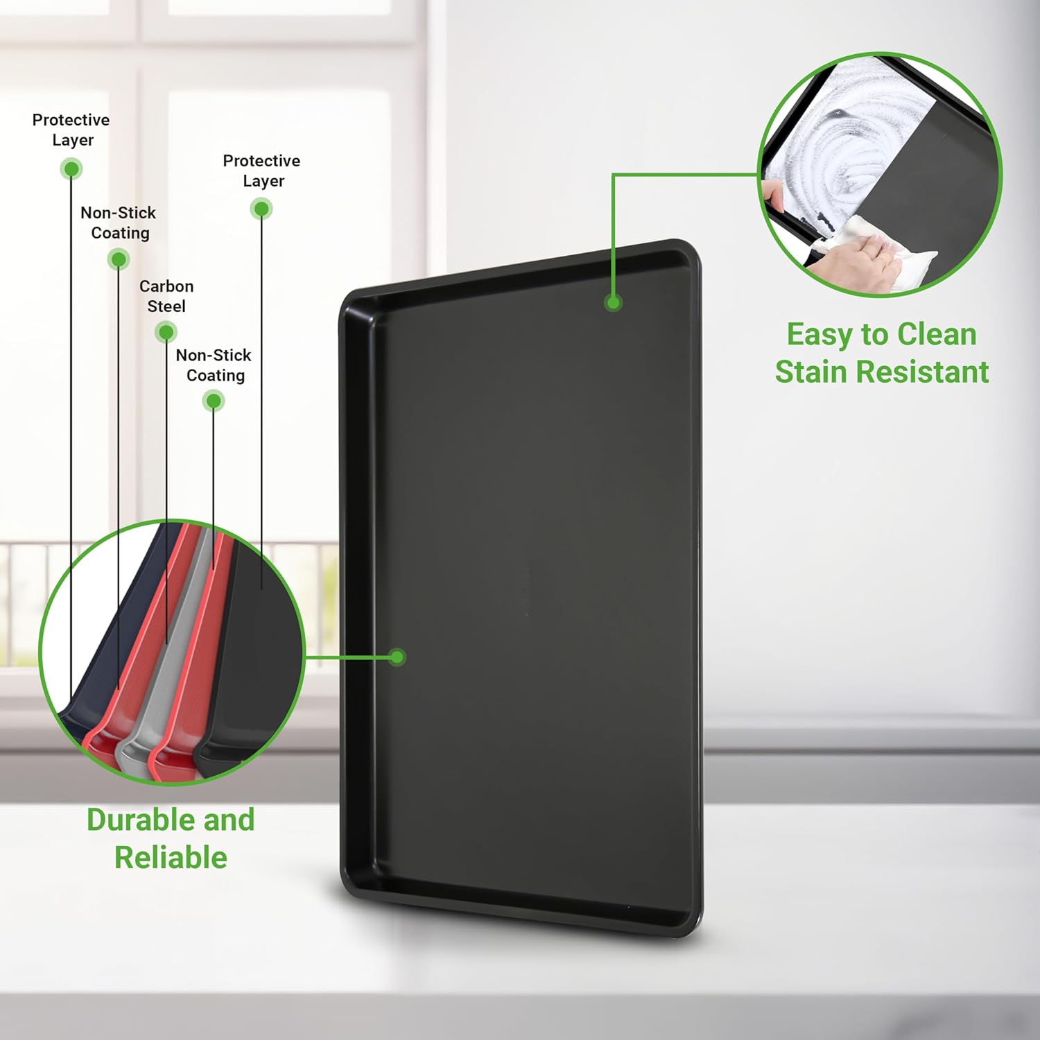 - NON-STICK COATING: The large cooking sheet pan features a non-stick coated layer surface that ensures quick, effortless food release and eliminates the need for butter, oil, or cooking spray. Makes tasty homemade baked goods slide out easily