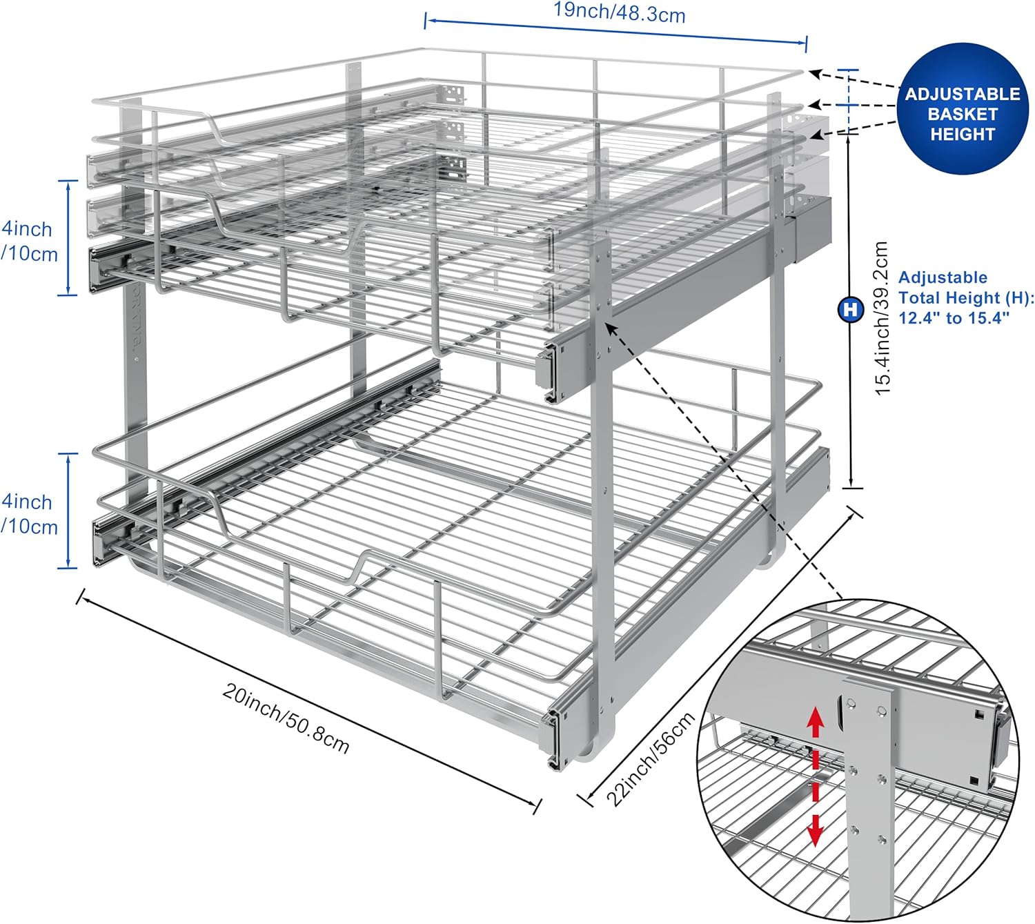 2 Tier Pull Out Cabinet Organizer 20" W X 22" D, Slide Out Drawers For Kitchen Cabinets, Pull Out Drawers For Cabinets Capacity Heavy Duty Caddy, Cabinet Pullout Shelves Chrome-Plated,Bathroom Pantry