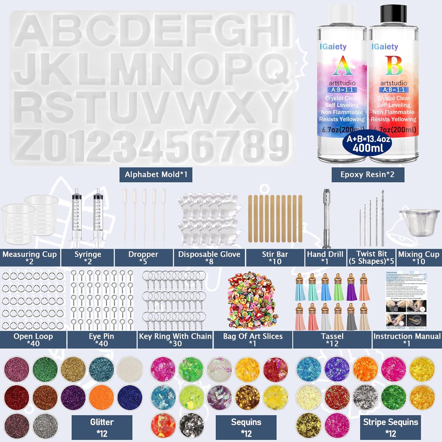 - Epoxy Resin Included: This resin starter kit contains two bottles of high-quality epoxy resin. The liquid is crystal clear and odorless, so you can be assured to use this resin kit. Compared with the same type combination on the market, the epoxy resin of this letter mold kit is easier to mix and the bubbles are easy to clear. The finished product from the alphabet mold is more shiny and does not turn yellow. This letter mold kit is the best for you to pursue high-quality work