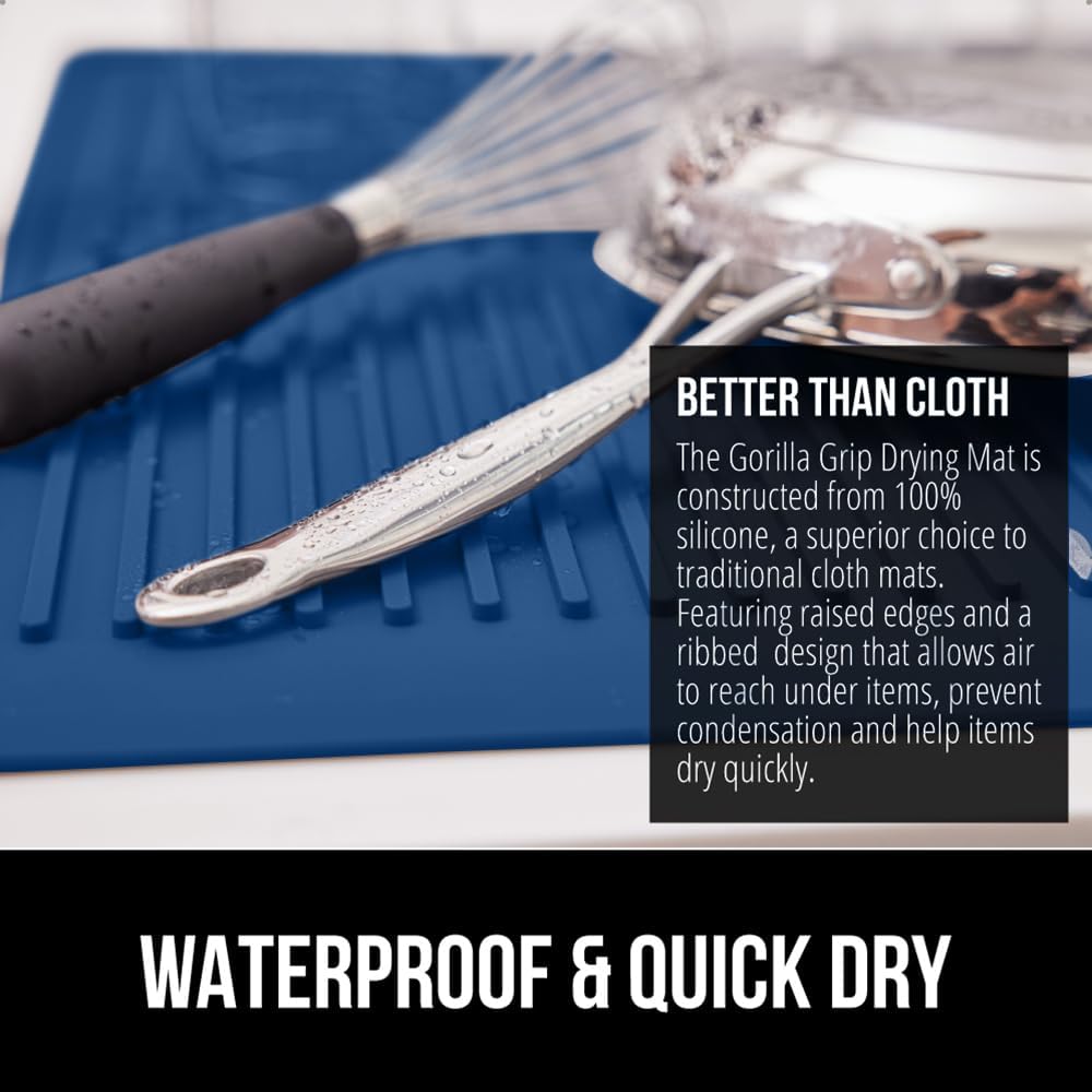 GORILLA GRIP 100% BPA-Free Patented Silicone Dish Drying Mat for Kitchen Counter, Water Catching Ribbed Design, Easy Clean Waterproof Sink Liner, Heat Resistant, Fits Under Rack, 16x12 Inch, Blue