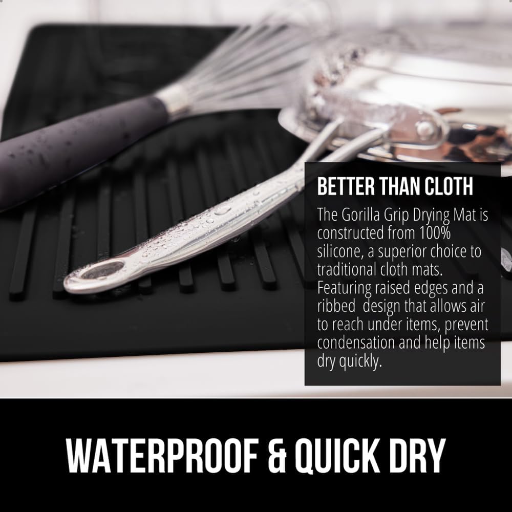 GORILLA GRIP 100% BPA-Free Patented Silicone Dish Drying Mat for Kitchen Counter, 18x16 Inch, Water Catching Ribbed Design, Easy Clean Waterproof Sink Liner, Heat Resistant, Fits Under Rack, Black