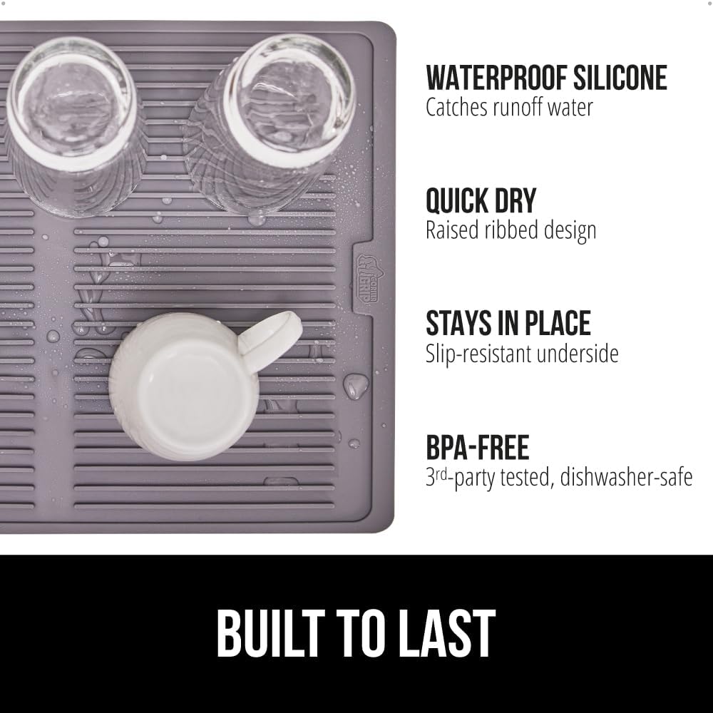 GORILLA GRIP 100% BPA-Free Patented Silicone Dish Drying Mat for Kitchen Counter, Water Catching Ribbed Design, Easy Clean Waterproof Sink Liner, Heat Resistant, Fits Under Rack, 13x11 Inch, Gray