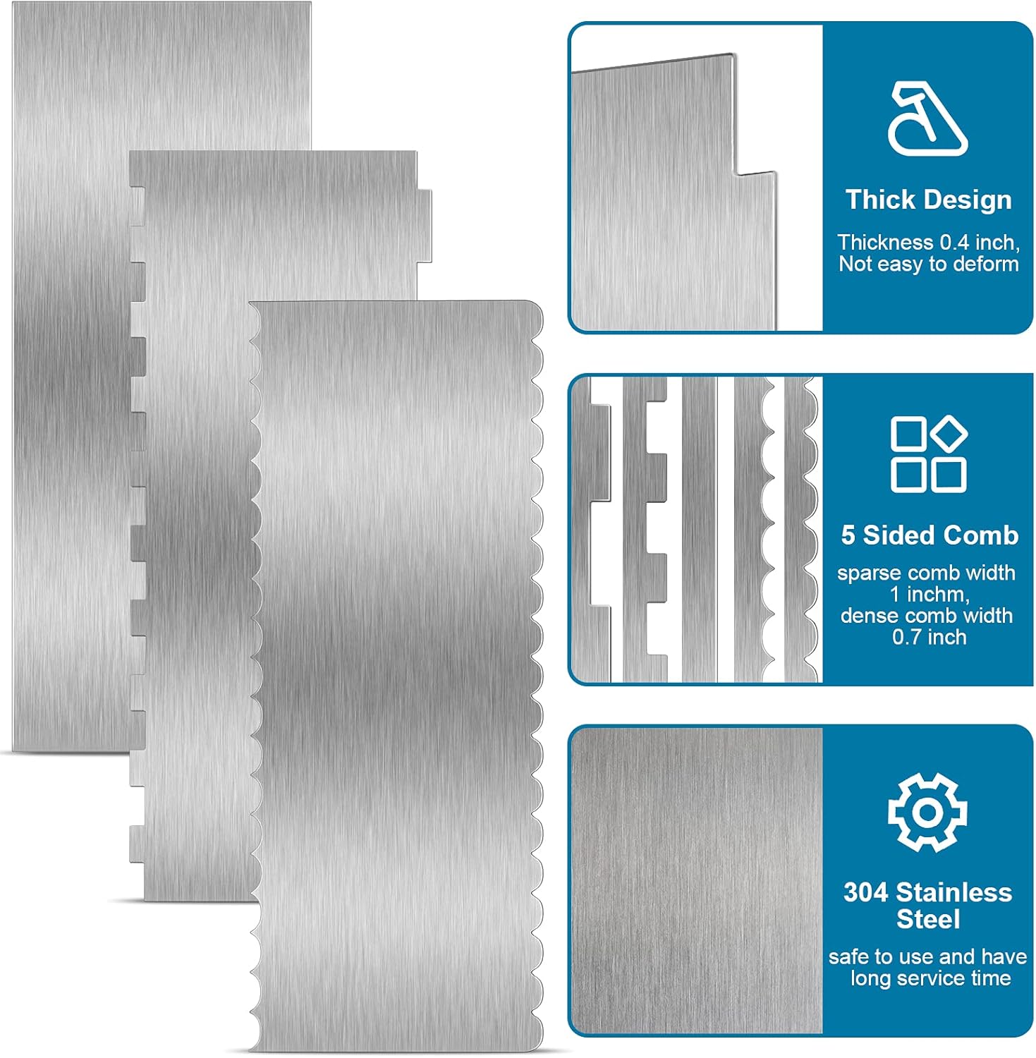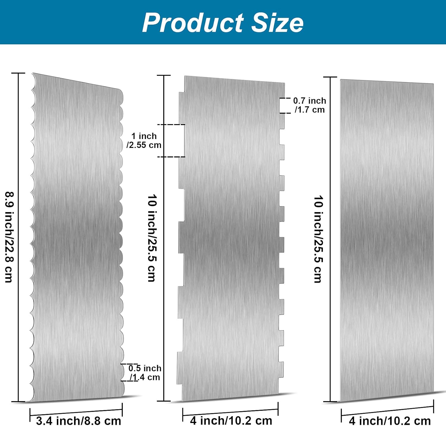 3 Pieces Stainless Steel Cake Scraper 10 Inch and 9 Inch Large Double Sided Patterned Edge Stripe Edge Smoother Scraper Cake Decorating Comb Pastry Cutter for Butter Mousse Cream Decoration