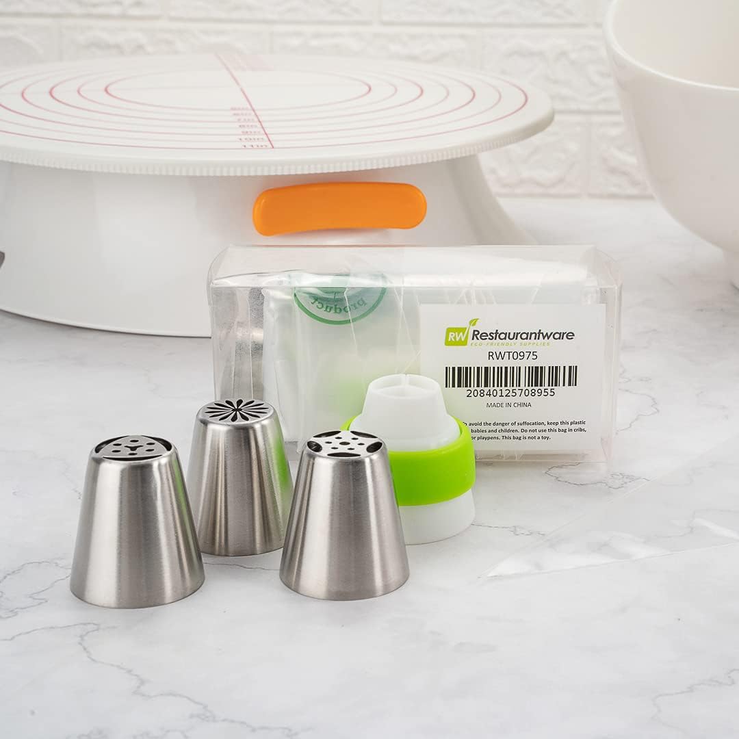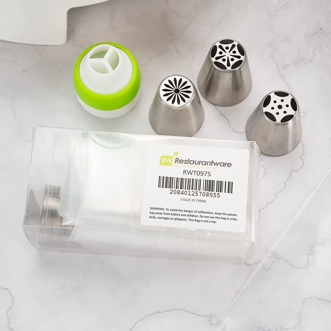 Restaurantware Pastry Tek Russian Piping Tips Set 23 Piece Durable Cake Decorating Kit - 12 Piping Tips 10 Piping Bags Stainless Steel Piping Bags And Tips Set 1 Tri-Color Coupler