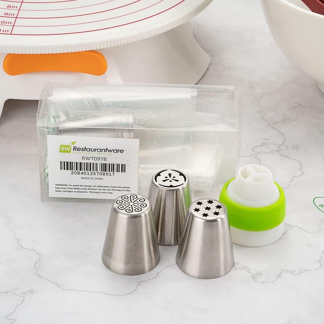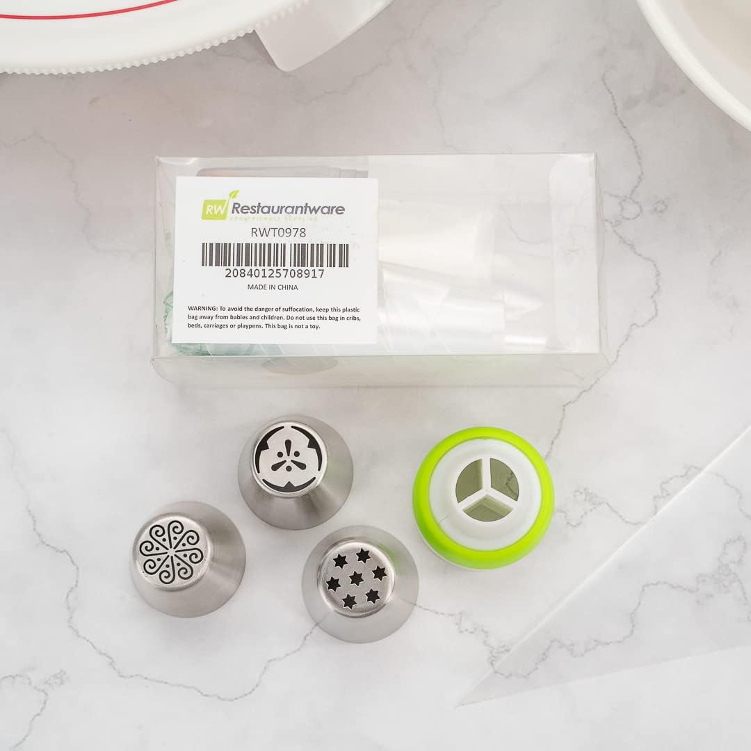 Restaurantware Pastry Tek Russian Piping Tips Set 17 Piece Durable Cake Decorating Kit - 6 Piping Tips 10 Piping Bags Stainless Steel Piping Bags And Tips Set 1 Tri-Color Coupler