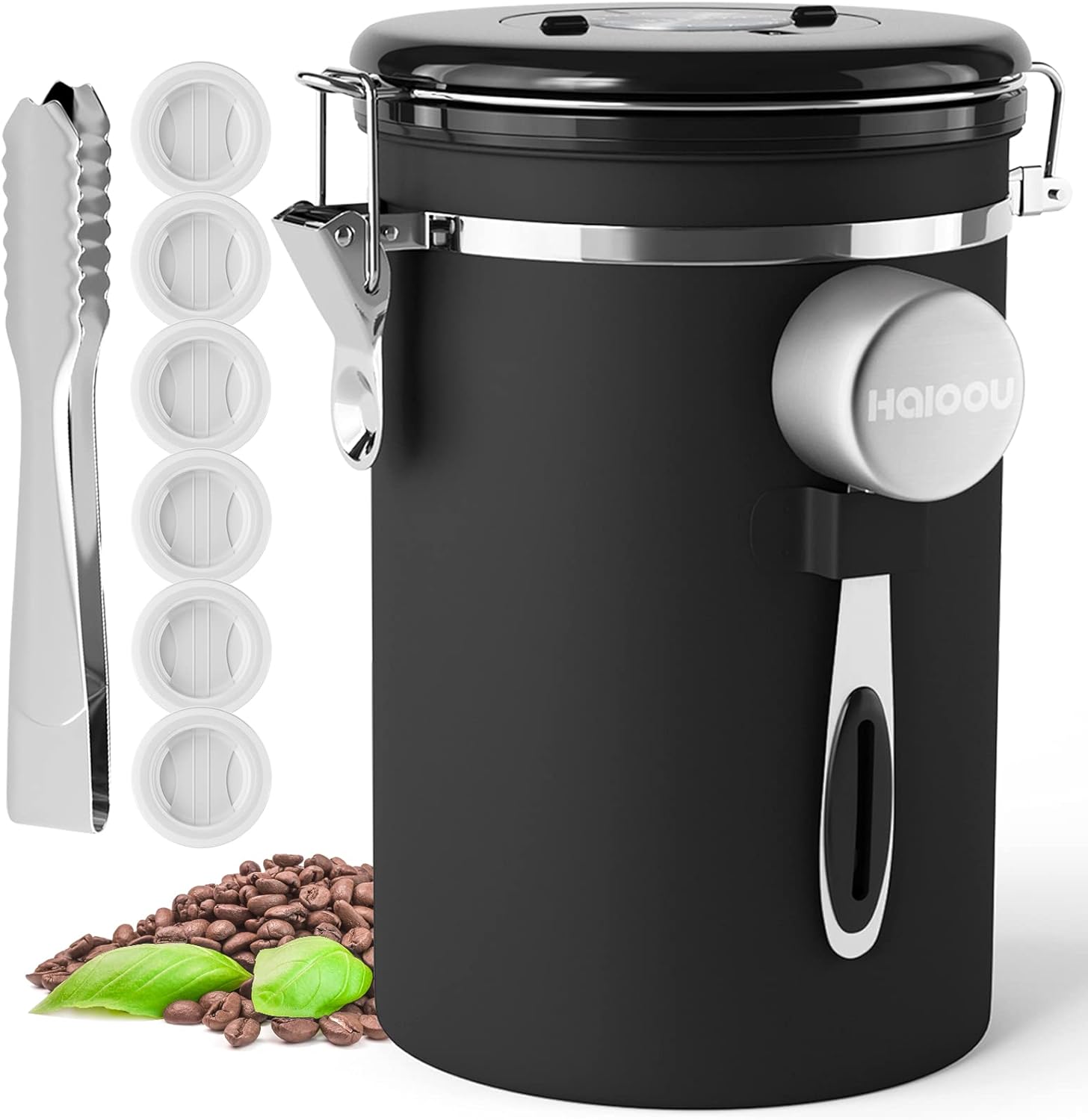 HAIOOU Airtight Coffee Canister, 22OZ Large Stainless Steel Coffee Bean Storage Container with Date Tracker, Measuring Scoop, 6Pcs CO2 Valves and Mini Tongs for Beans, Grounds, Sugar and more - Black