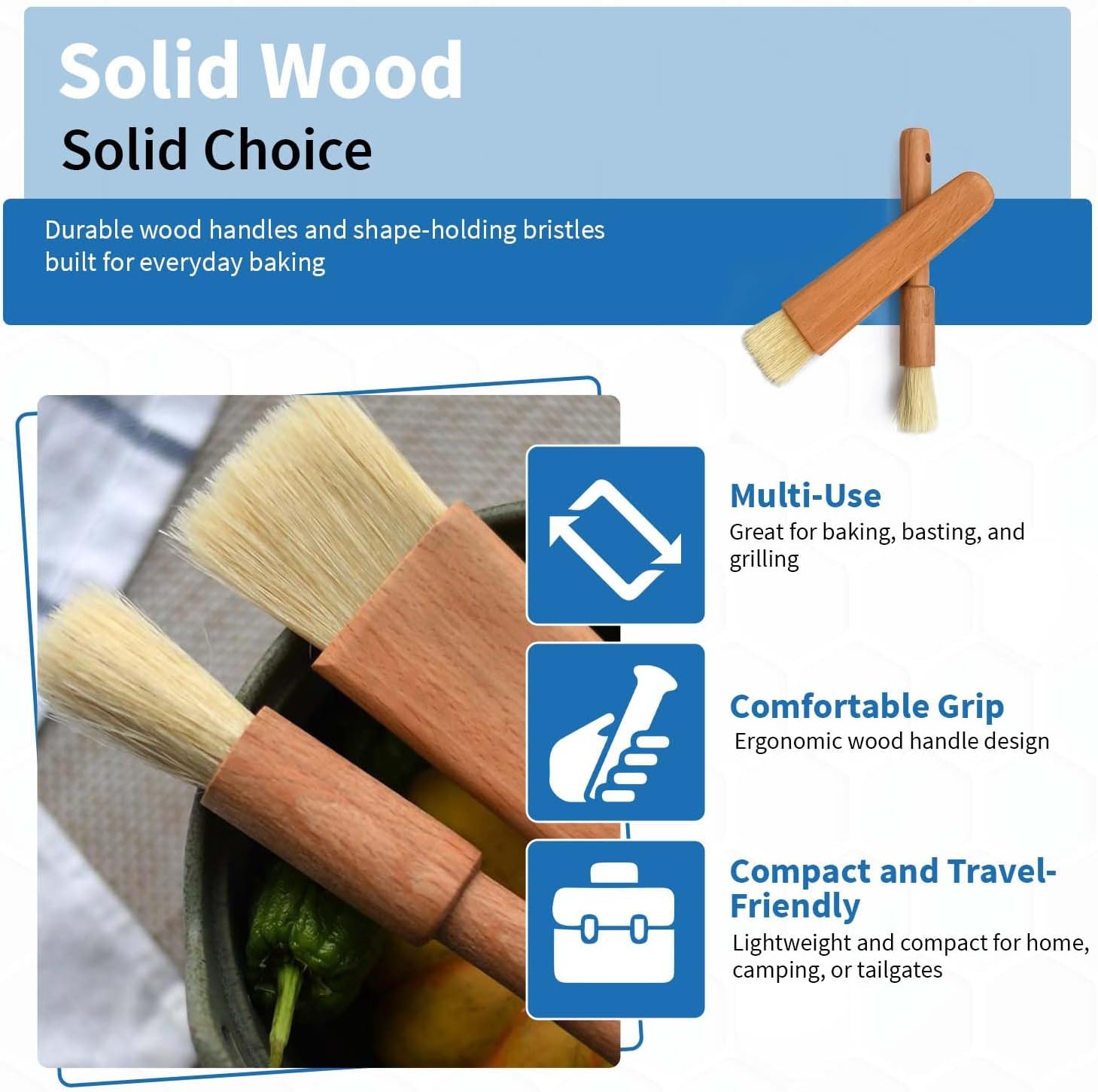 - Bakery Brushes for Baking and BBQ: Ideal for both the oven and the grill, these food brushes for cooking handle everything from delicately brushing egg wash on pastries to generously glazing meats. The flat and round brush heads provide the control and coverage needed for precise baking and bold barbecue flavor.