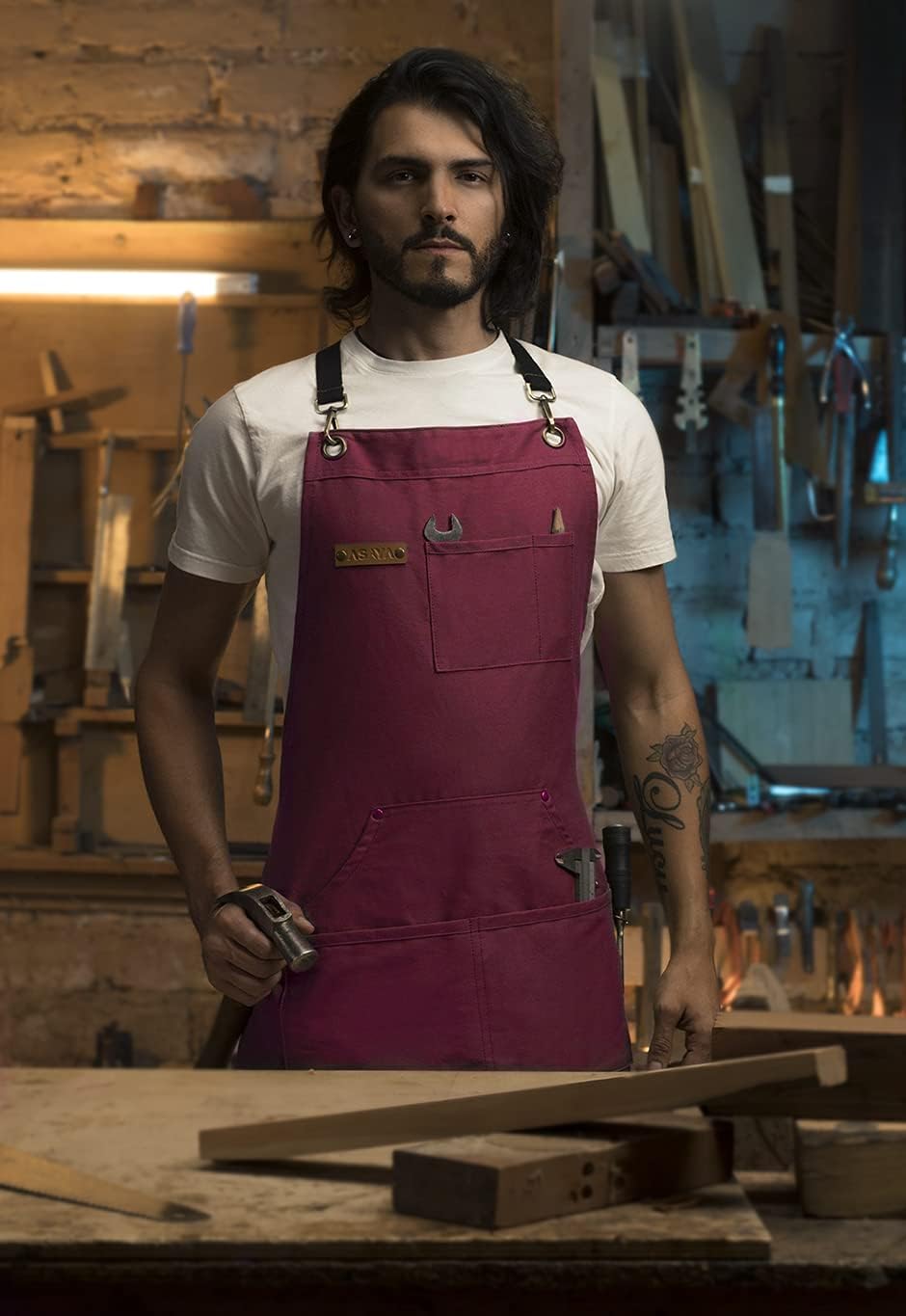• EXPERT CRAFTSMANSHIP - Asaya Chef, BBQ and Work Aprons are designed from high quality materials and built to last through years of wear and tear in the kitchen or workshop They are hand crafted with double stitched 10oz cotton canvas, stainless steel or brass hardware and leather accents.