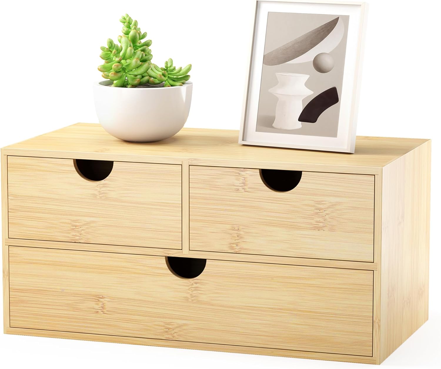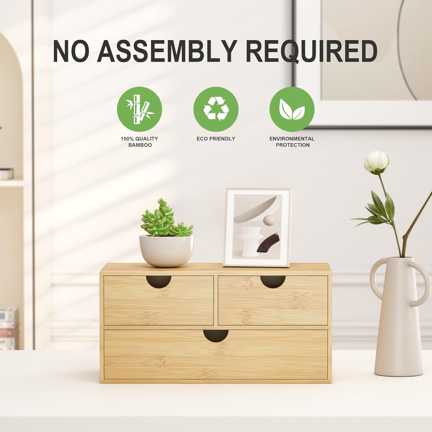Bamboo Desk Organizer with Drawers - Small Desktop Countertop Mini Tabletop Storage Container - No Assembly Required