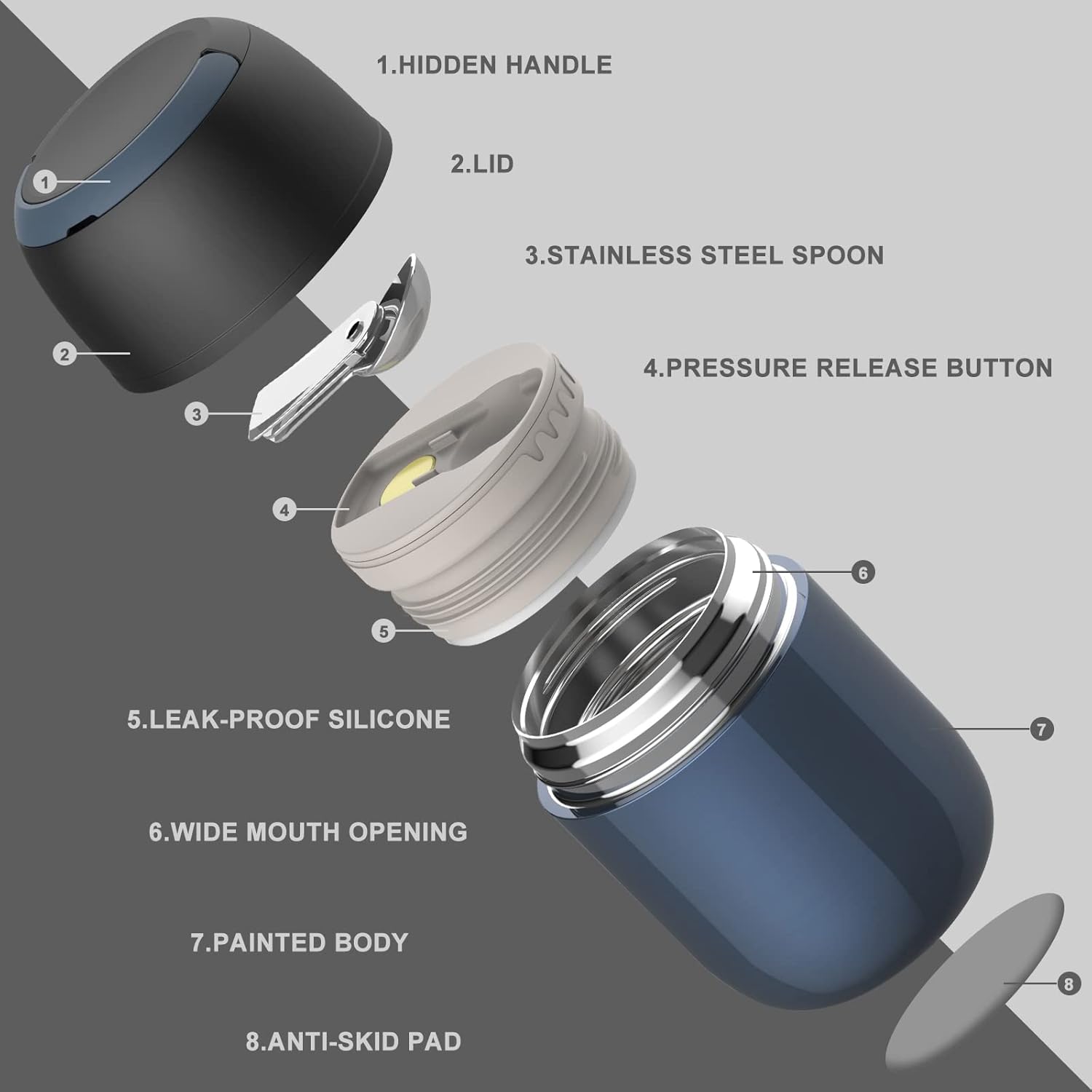 - Our insulated food jar has a unique hidden handle that can reduce the volume of the jar and save more space for you. It fits perfectly in school bags and boxes. The hidden handle could also avoid accidentally opening the lid while carrying school bags.