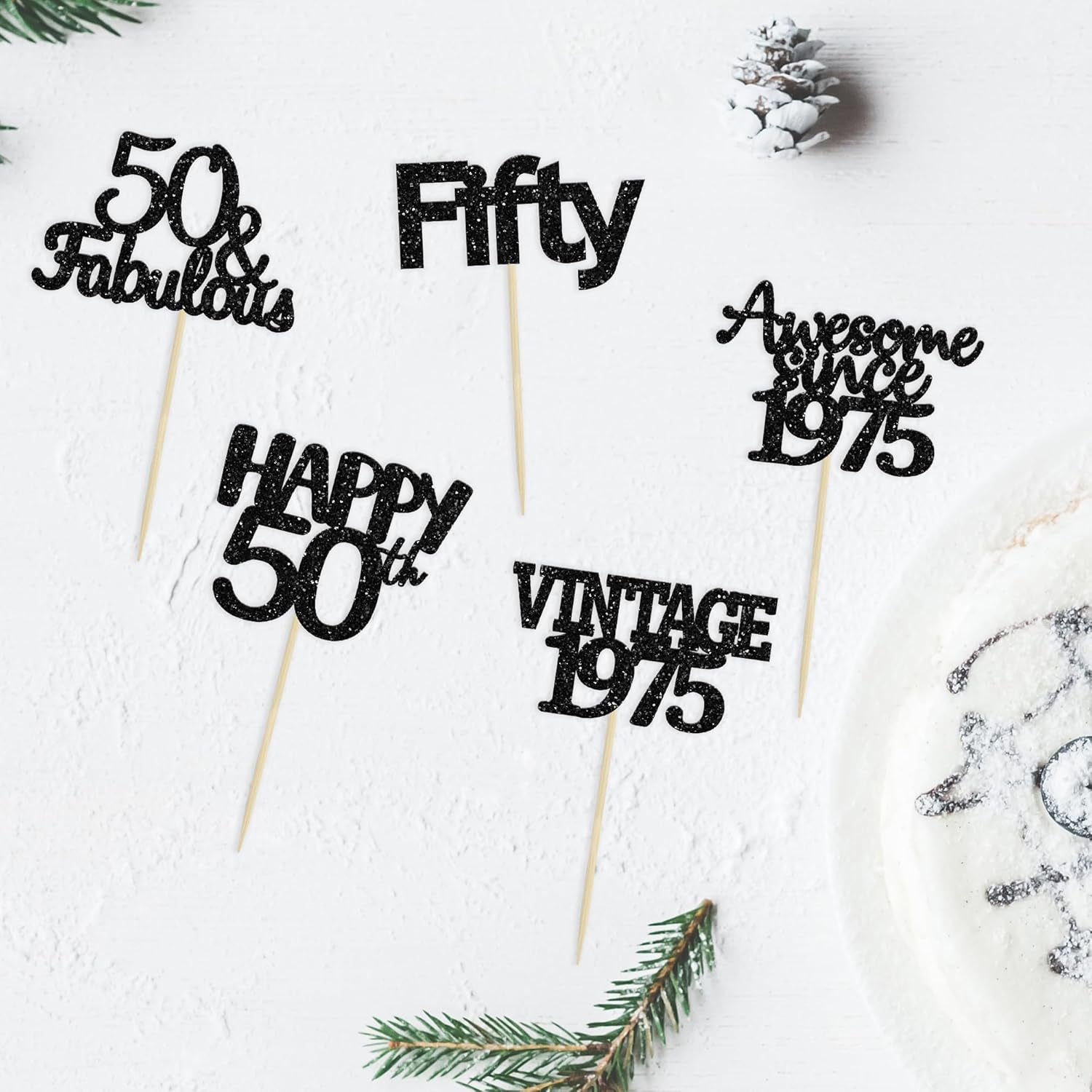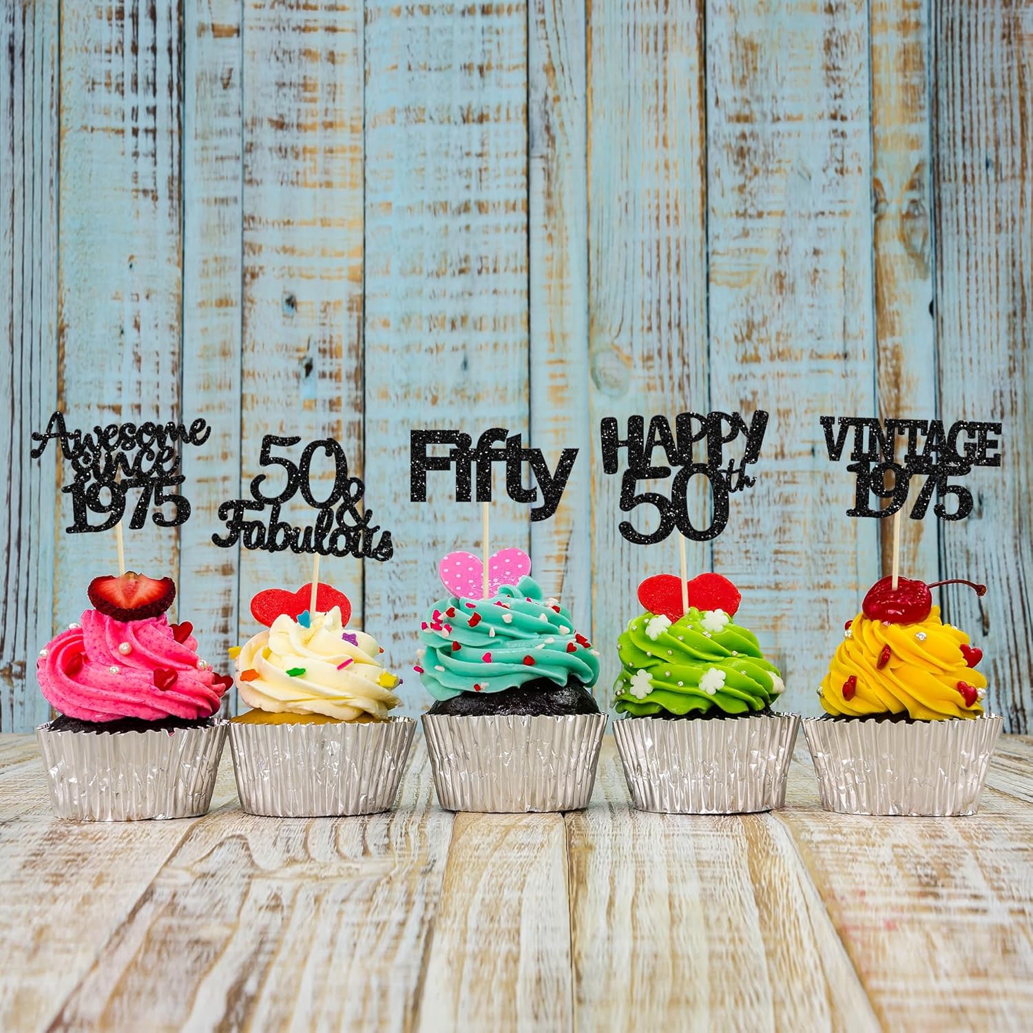 Gyufise 30Pcs Vintage 1975 Cupcake Toppers 50th Birthday Cake Decorations Cheers to 50 Fabulous Fifty Cupcake Picks 50th Birthday Wedding Anniversary Party Cake Decorations Supplies Black