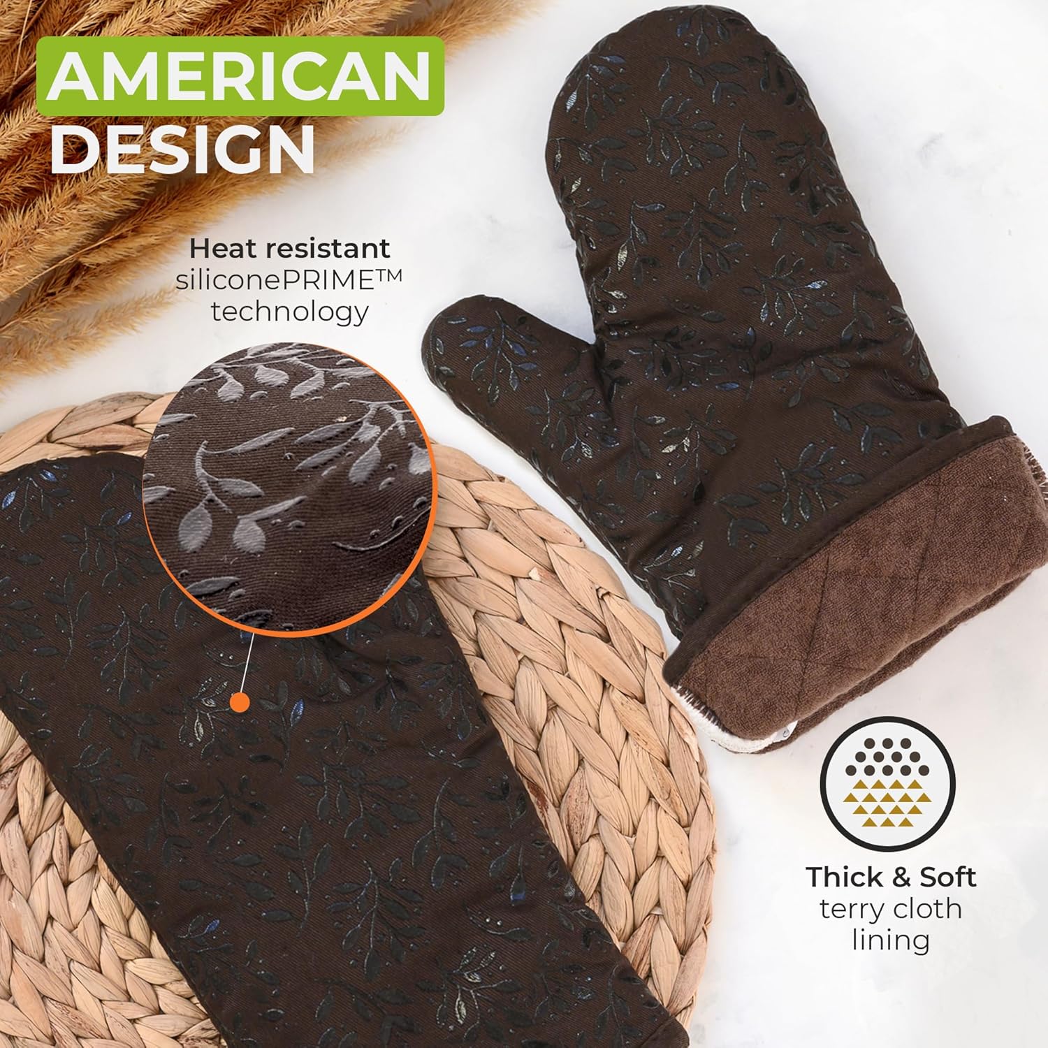 - Heat Resistant: These oven mitts are thick and have an outer surface made entirely of genuine siliconePRIME and are lined with terry cloth cotton, making them resistant to high temperatures. This, along with their extra-long sleeves (13”), makes them a safe and comfortable choice for cooking or baking in the kitchen.