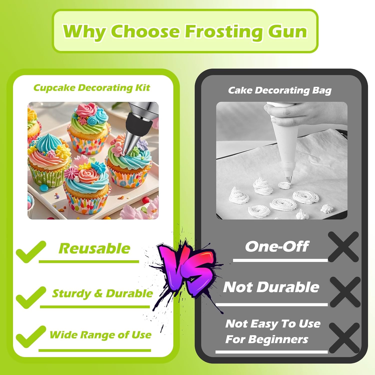 - Cake Decorating Kit: You will get a frosting gun, 6 replaceable piping tips, which 2 piping tip couplers, 9 silicone cupcakes, 18 in total; These cake decorating tools can meet your cake and cookie decoration needs