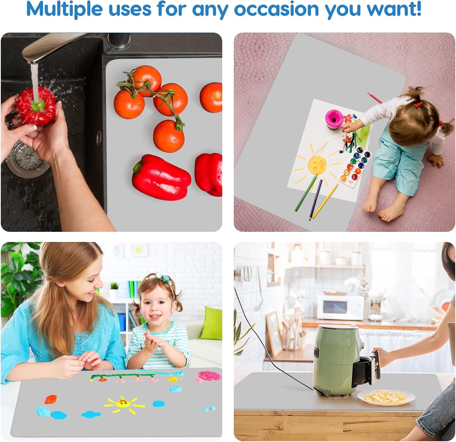 - 【A MUST-HAVE MAT】: Our extra large silicone counter mat are widely used for home, kitchen, office, classroom, outdoor, baby, pet and any occasion. Can be used as countertop mat, table mat, pastry mat, placement mat, heat resistant mat, craft mat, pet feeding mat or a baby pad etc. Table protector, mat for crafts, jewelry, casting moulds and other DIY tools and materials. It’s cuttable to fit different sizes and shapes.