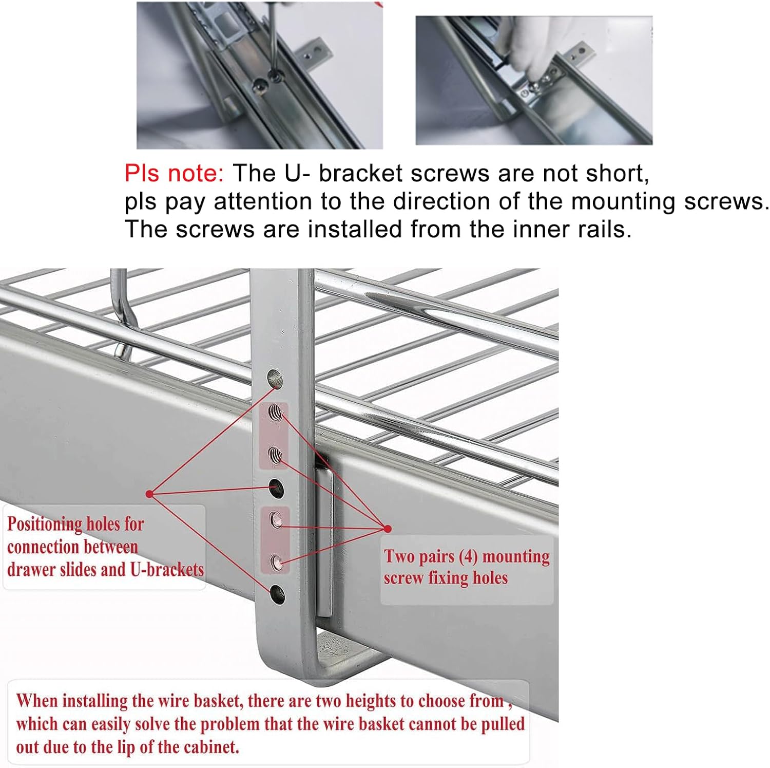 - ※ Excellent Design: The upper and lower wire baskets of this Cabinet Organizer has 2 height adjustment options, and the installation compatibility in the cabinet is better. When installing the lower wire basket, there are two heights to choose from, Which can easily solve the problem that the lower wire basket cannot be pulled out due to the lip of the cabinet. with a minimum height of 13.8 inches and a maximum height of 15 inches. Rear mounting brackets are optional and can be used or not.