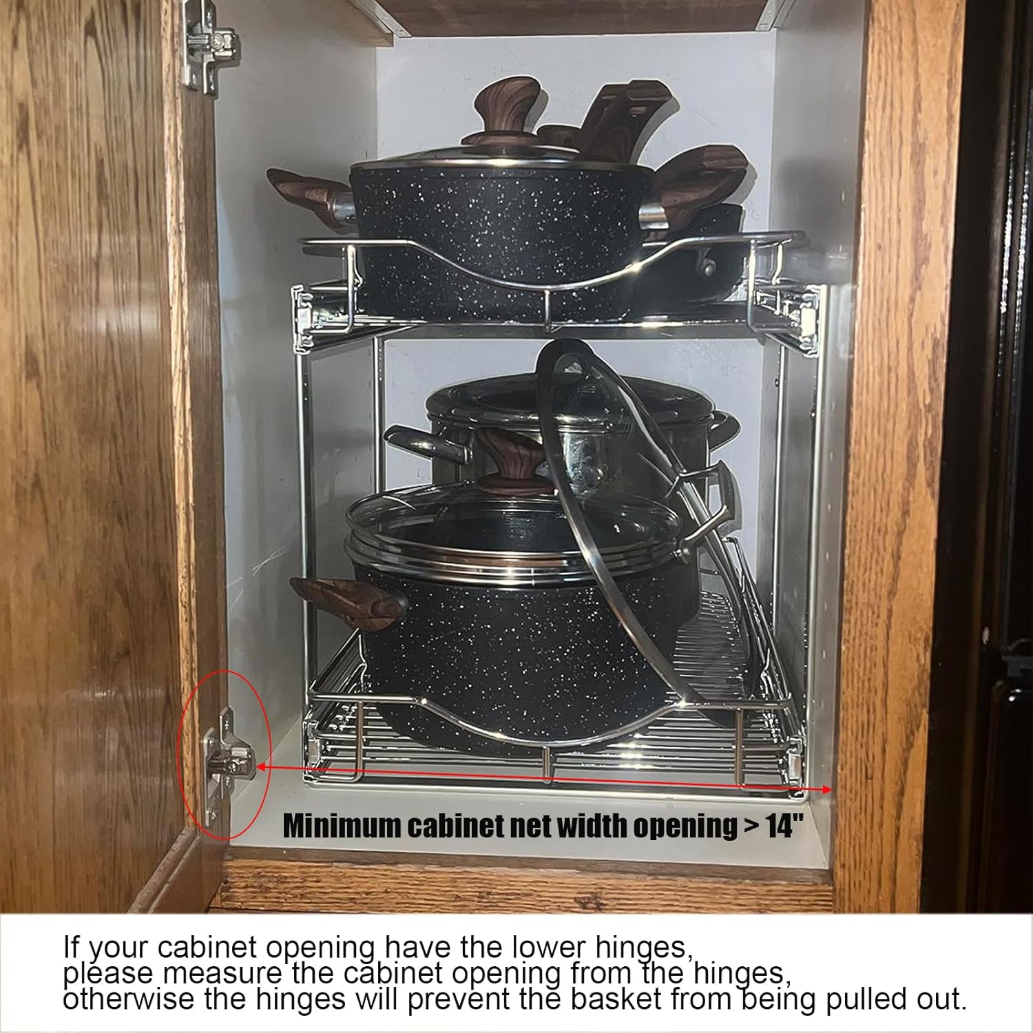 DINDON 2 Tier Pull Out Cabinet Organizer (14" W X 18" D), Double Tier Wire Basket Slide Out Shelf Storage for Kitchen Base Cabinet Organization for Kitchen, Pantry, Bathroom, Chrome