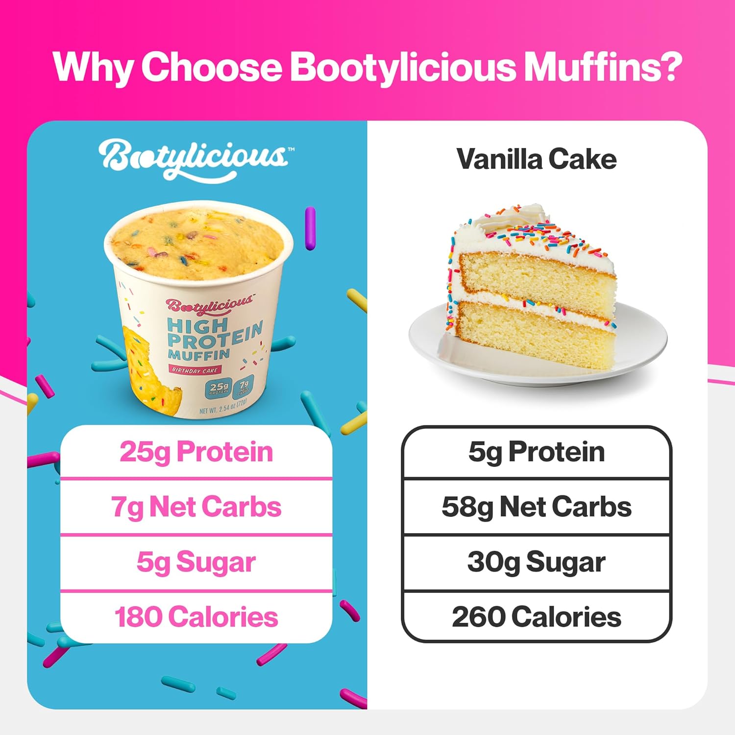 - STAY FULL LONGER: Bootylicious Birthday Cake muffins are packed with 16g of dietary fiber to help keep you full longer and assist in your daily fiber intake.