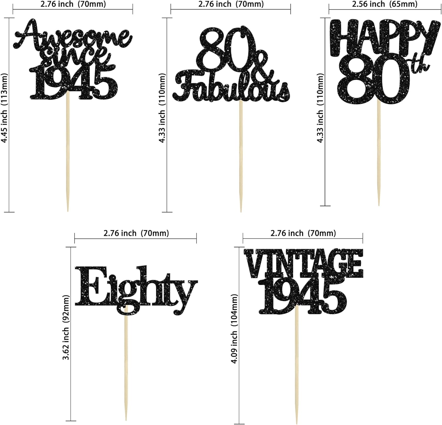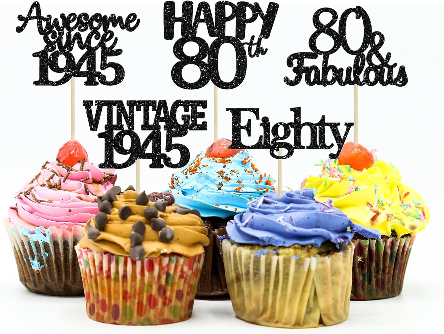 - ♡These glitter Black 80 Cupcake Toppers are so cute and good for vintage 1945 theme party, 80th birthday party, 80th wedding anniversary birthday party cake decoration. They can make your cupcake more attractive and bring the fun to your party. You can also apply them for ice cream, fruits, cookies and other desserts.