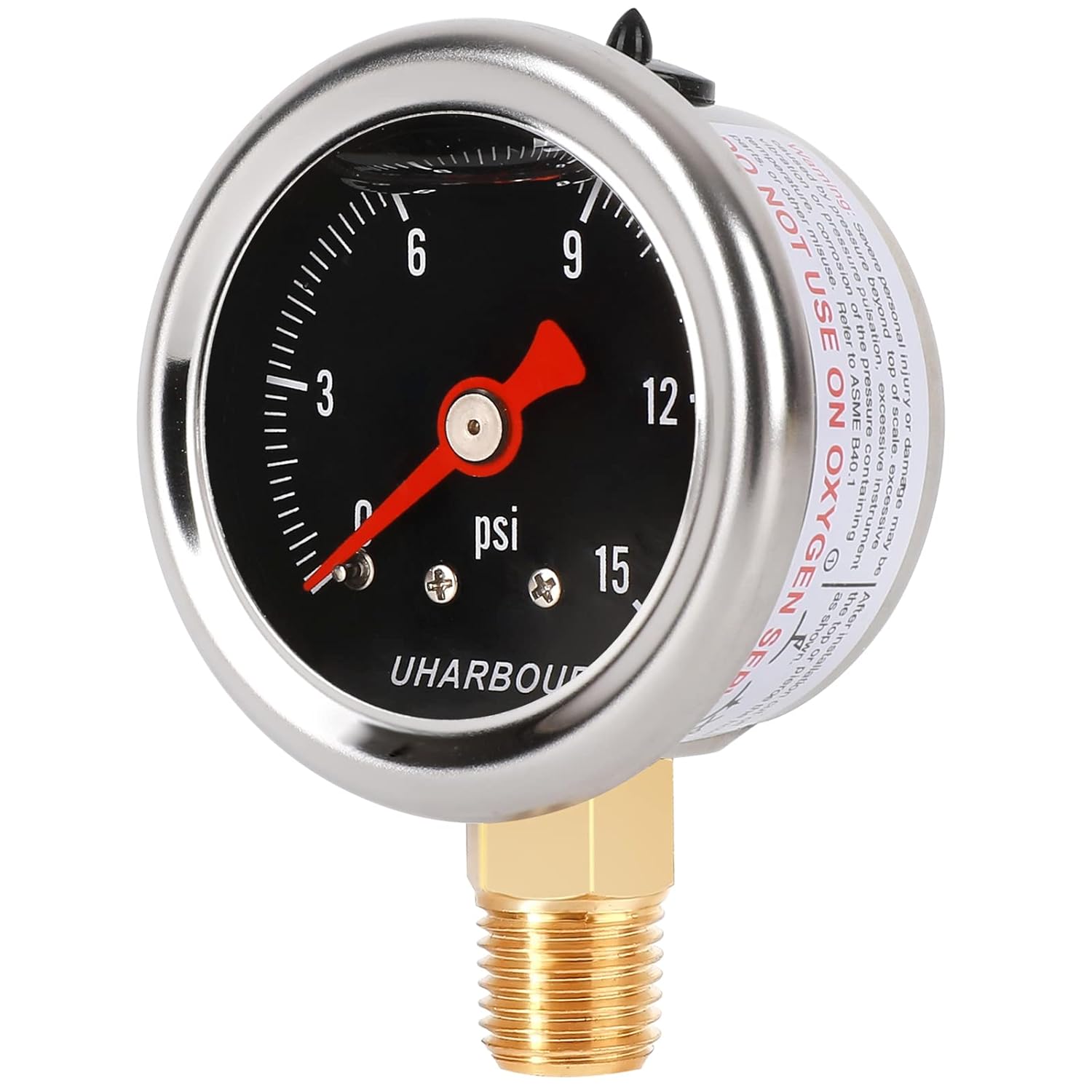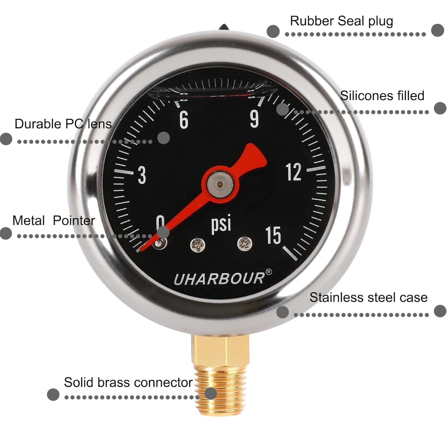 - LIQUID FILLING 1/8 FUEL PRESSURE GAUGE WITH 1-1/2" CLEAR Black DIAL : Glycerin oil filled to enhance the reliability and integrity; helps dampen the effect of vibration and pulsation; Clear Black dial with single colors scales make it easy to read;