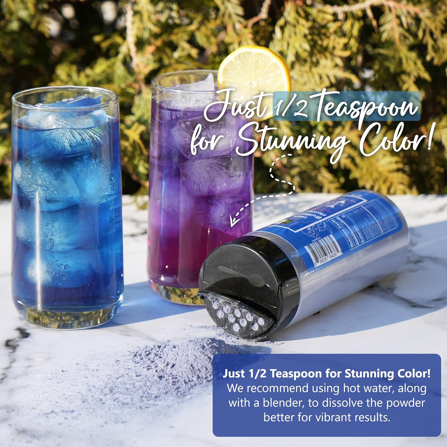 - Color-Changing: When you add lemon, lime or other citrus ingredients to well mixed butterfly pea powder liquid, it will change to Violet or Pink.